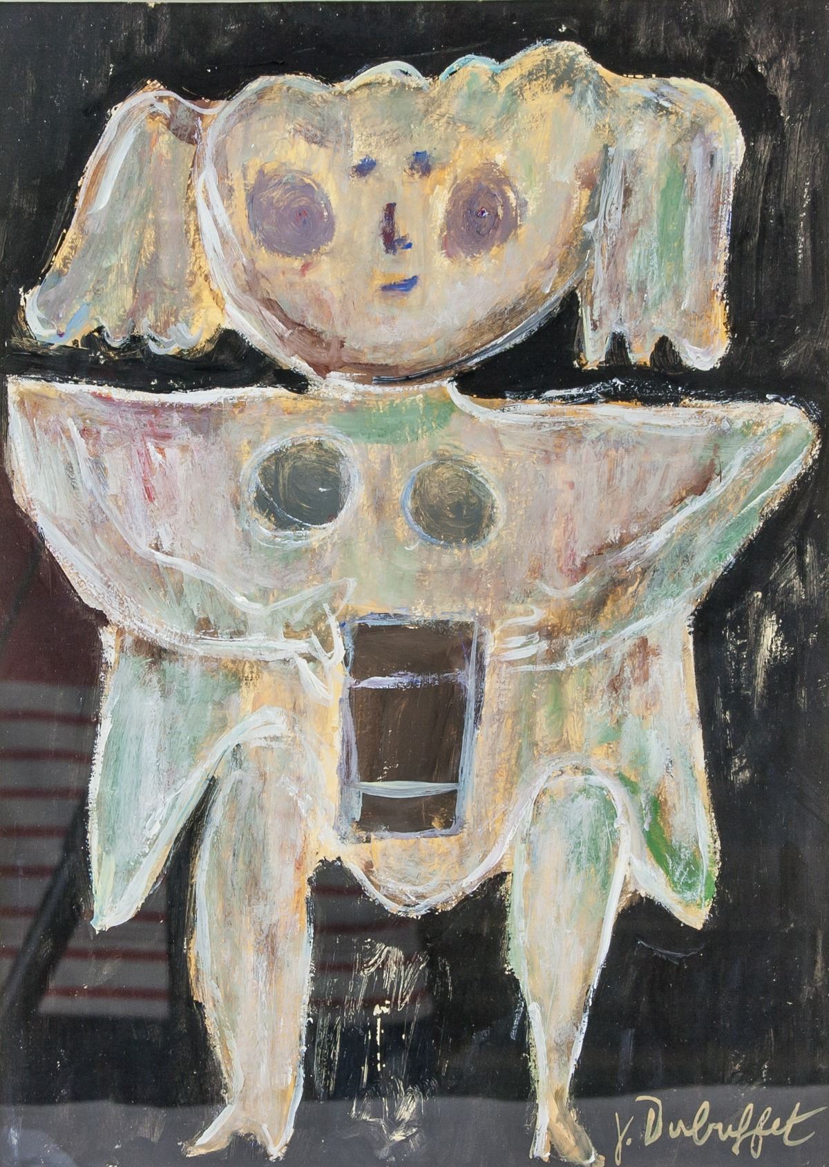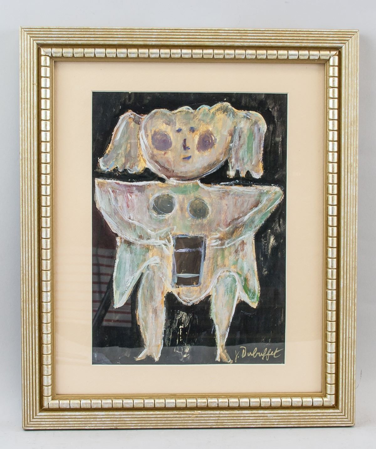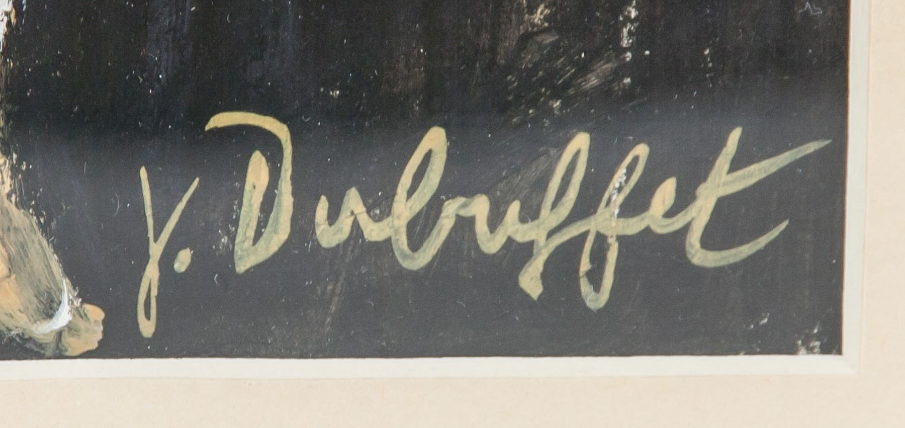 Oil on paper, framed. Featuring an surreal figure. Signed and attr. Jean Dubuffet (French, 1901-1985) on the lower right corner. 25.5 x 18.5 cm (10 x 7.3 inches). Jean Dubuffet was an integral French artist known for his primal paintings and sculptures of vernacular subjects. His adoption of the term Art Brut or raw art, referred to the art of children, prisoners, and the mentally ill, was a reaction to what he called art culturel or refined art. It was his desire to break from tradition by implementing rudimentary mark making and emulsions made from sand, tar, and trash, as seen in his work Grand Maitre of the Outsider (1946). “A work of art is only of interest, in my opinion, when it is an immediate and direct projection of what is happening in the depth of a person's being,” the artist said. “It is my belief that only in this Art Brut can we find the natural and normal processes of artistic creation in their pure and elementary state.” Born on July 31, 1901 in Le Havre, France, he went on to study Académie Julian in Paris. While at school his peers included Raoul Dufy, Suzanne Valadon, and Fernand Léger. In 1918, after attending classes for only six months he dropped out. Taking over his father’s wine business in 1924, he didn’t return to making art until the early 1940s. The artist would go on to form the Compagnie de l’Art Brut with André Breton and Slavko Kopac. The artist died on May 12, 1985 in Paris, France at the age of 83. Today, his works are held in the collections of the Art Institute of Chicago, The Museum of Modern Art in New York, the National Gallery of Art in Washington, D.C., and the Centre Georges Pompidou in Paris. PROVENANCE: Southern Ontario estate
