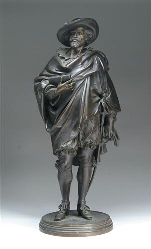 JEAN JULES SALMSON (French, 1823-1902) A CAVALIER. Fine bronze figure of a man in cloak with sword at side holding glove in one hand and book in another. He wears a wide brim hat with tassel and decorated collar. On a round base which is signed on top Salmson. SIZE: 22-1/2in. h. CONDITION: Very good. 9-26169
