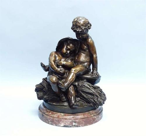 JEAN MARIE PIGALLE (1792-1857) - French school. A rare brown patinated bronze figural group of two young nude children resting on a sheaf of wheat. Signed. Raised on rouge marble base. 16 1/2" high. Circa 1880. Reference: Benezit, volume 6, page 681. 12000-15000