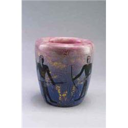 JEAN MAYODON, Sèvres Vase, Keramik. Heller Scherben mit farbiger Bemalung, auf rosé- und violettfarbenem Fond mit Blattgoldauflagen Darstellung von ägyptischen Kriegern. Über rundem Stand leicht konische Form, breiter, wulstförmiger Mündungsrand eingezogen. H.: 14 cm. Bez.: Künstlermonogramm (schwarz gemalt). 1920er Jahre Lit.: Europäische Keramik 1880-1930, Slg. Silzer, Ausst.kat. des Hessischen Landesmuseums Darmstadt 1986, Abb. S. 138 (zu Arbeiten).