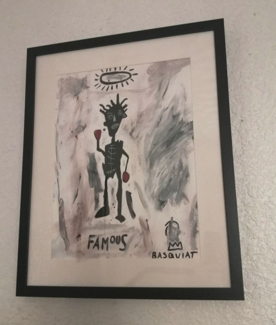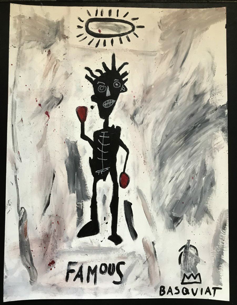 A painting by Jean-Michel Basquiat of himself as a boxer. Signed. Many of Basquiat’s paintings are in some way autobiographical. Developing his own personal iconography, in this early work, Basquiat both alludes to modernist appropriation of African masks and employs the mask as a means of exploring identity.in 1985, he posed with his friend Andy Warhol for a series of shots for a photoshoot of the two sparring.