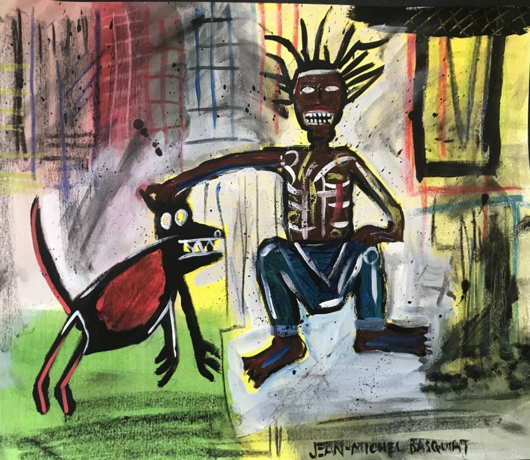 A painting of a fearsome Basquiat and dog, full of the energy and colour that typifies graffiti artist Jean-Michel Basquiat’s work. Additionally signed at the bottom by Jean-Michel Basquait measuring 13.5x11.75 inches. Professionally mounted and framed and supplied with coa.
