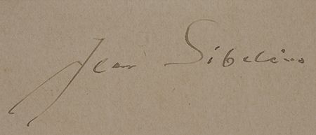 (1865-1957) Finnish composer in the Classical style, he wrote seven symphonies, piano music and over one hundred songs. Bold signature on a card, handsomely matted in rust and set with a portrait into a gilt frame. Very good condition, not examined out of frame.