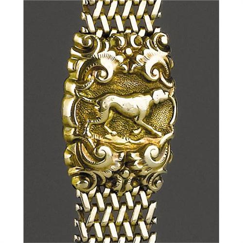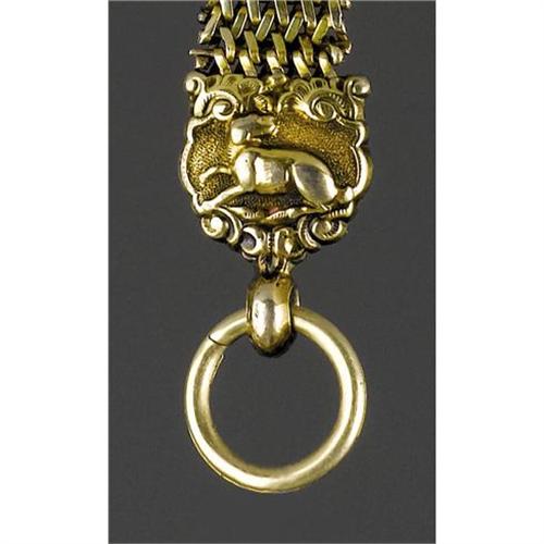 <B>JEB Stuart's Gold Watch Fob.</B></I> Constructed with a tightly-woven interlinking pattern, this fob is decorated with a hunting dog motif approximately one-third down the chain and another at the bottom. Stuart is wearing this same fob in a photograph taken at his West Point graduation standing between Robert E. Lee's son, George Washington Custis Lee, and Stephen Dill Lee. This may also have been a graduation gift as he is proudly wearing it in this famous photograph with the Lees. <BR><BR><I>Provenance</B></I>: Stuart Family correspondence and Bill of Sale. Accompanied by copy print of his West Point photograph.<BR><BR><b>Shipping:</b> Small Collectibles (<a target="_blank" href="http://www.heritageauctions.com/common/shipping.php">view shipping information</a>) <BR><BR><B>Important notice