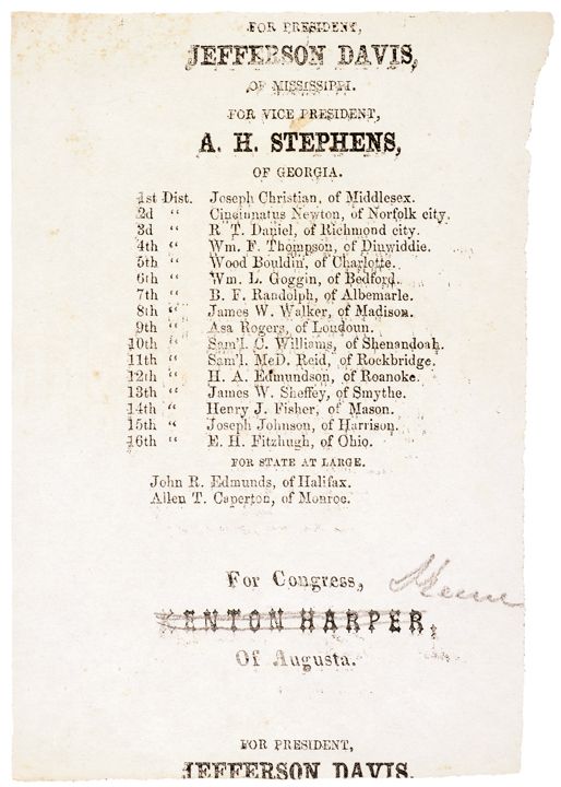 Printed “Electoral Ticket For President And Vice President,” black ink on white paper, for the state of Virginia, approx. 6.25” x 4.25”, Very Choice Extremely Fine. Header reads: “For President, JEFFERSON DAVIS, Of Mississippi. For Vice President, A. H. STEPHENS, Of Georgia.” Other candidates for state office are listed further below. Signed in pencil on the back by the voter who actually cast this ballot. At bottom, the printed name “Kenton Harper” for Congress has been crossed out in pencil, and “Keene” has been written in its place. Some minor foxing, otherwise quite clean and clear.