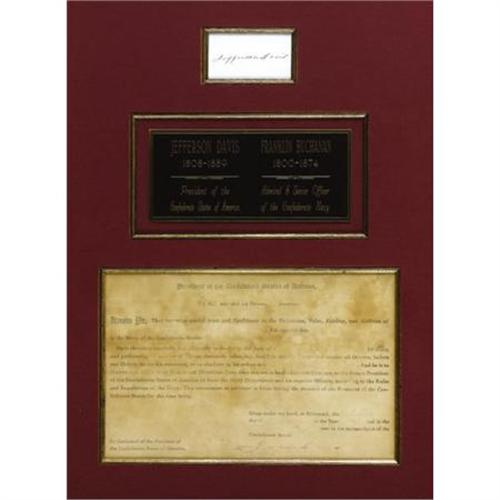 <B>JEFFERSON DAVIS APPOINTS FRANKLIN BUCHANAN, FORMER SUPERINTENDENT OF THE UNITED STATES NAVAL ACADEMY, A CAPTAIN IN THE CONFEDERATE NAVY</B></I>. Buchanan had resigned his commission in the Federal Service in the belief that his native Maryland would secede from the Union. In September 1861, in what is purported to be the first Confederate naval appointment, Davis awards Buchanan a captaincy. His first assignment was the famed ironclad warship the C.S.S. <I>Virginia</B></I>, a refitted version of the Union vessel <I>Merrimack</B></I>. Buchanan commanded the <I>Virginia</B></I> in its determined attempt to break the Union blockade by assaulting the Federal fleet headquartered at Fort Monroe, Virginia. The ship came under heavy fire, and Buchanan was seriously wounded in the famed Battle of Hampton Roads, for which he would be promoted to admiral by Jefferson Davis. Buchanan was forced to relinquish command, and the <I>Virginia</B></I> was battled to a draw by the Union ironclad <I>Monitor</B></I> the following day in one of the most famous engagements of the War.<BR><BR>This historically important appointment is unfortunately faded, with both the printed text somewhat light and the Davis signature and other handwritten entries significantly so. Light overall age browning detracts minimally. While not the right item for a condition fanatic, this remains an important Confederate artifact. It has been elegantly custom matted and framed for display, along with a fine Davis signed card. The document itself measures 10.5” x 6.75”, and the entire framed display is 17.5” x 22.5”.<BR><BR><B>Provenance: </B></I>See Admiral Buchanan's Confederate Flag Lot #72374<BR><BR><b>Shipping:</b> Framed - without Glass, Medium (<a target="_blank" href="http://www.heritageauctions.com/common/shipping.php">view shipping information</a>)