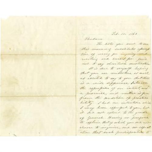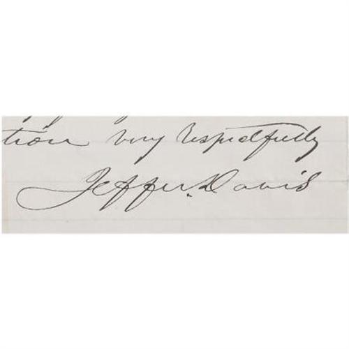<B>JEFFERSON DAVIS AUTOGRAPH LETTER SIGNED, 1863.</B></I> Davis (June 3, 1808 - December 6, 1889) was an American politician who served as President of the Confederate States of America for its entire history from 1861 to 1865 during the American Civil War. During his presidency, Davis was never able to find a strategy that would defeat the larger, more industrially developed Union. Davis's insistence on independence even in the face of crushing defeat prolonged the war, and while not exactly disgraced, he was displaced in Southern affection after the war by the leading general, Robert E. Lee<BR><BR>Jefferson Davis ALS <I>“Jefferson Davis”. </B></I>Two pages, 5” x 8”, lined letterhead, Feb. 16, 1863. <I>“Madam, The letter you sent to me this morning substitute’s assumption of many for inquiry and reviling and cursed for pair not to say charitable construction. It is due to myself hoping that you are mistaken as well as excited to say to you that there is a wide difference between the expression of an intent, and a promise, and neither is free from the condition of practice ability. I had an intrusion which I may have expected to you, but it did not extend to the grade of General. Having no purpose to explain that of which you did not choose to inquire, and no expectation that such predisposition to censure and malign would be benefited by explanation is only remained for me to subscribe myself with true sympathy for your domestic affliction, very respectfully, Jefferson Davis”</B></I>. Great personal letter from he president of the Confederacy<BR><BR><B>Condition:</B></I> Fine, has separations in folds, some foxing.<BR><BR><b>Shipping:</b> Flat Material, Small (<a target="_blank" href="http://www.heritageauctions.com/common/shipping.php">view shipping information</a>)