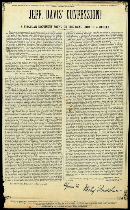 A fascinating Union propaganda item, a broadside, 8 1/2" x 14", signed in type by one Wesley Bradshaw and printed by Alexander & Co., Philadelphia. The broadside is headed: "JEFF DAVIS' CONFESSION! A SINGULAR DOCUMENT FOUND ON THE DEAD BODY OF A REBEL!". The text opens explaining that a letter had been found on the body of a Confederate courier, sent by a personal secretary to Davis to a relative in Cincinnati. The letter, addressed to Americans on both sides of the conflict, was contained within an envelope marked: "To be opened after my death. Jefferson Davis", with contents reading, in small part: "...The terrible game, which I have been playing for a lifetime, has gone against me...Had I won, I would, within five years from now, have made myself Emperor of America...". The broadside then goes into great detail, with Davis explaining how after reading of the exploits of Napoleon as a youth, he was determined to control the country through political machinations and alignment with the Democratic Party. He notes: "...the division of the Democratic Party was really accomplished by my influence...the election of Abraham Lincoln was insured by my money, as well as my influence...". Davis' letter ends with the hopes that despite his evil intentions and now that he has gone to the great beyond, he prays that Americans will embrace the Constitution and reunite for the benefit of all. A terrific fantasy, some of the best nonsense we've seen come out of the Civil War!