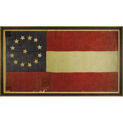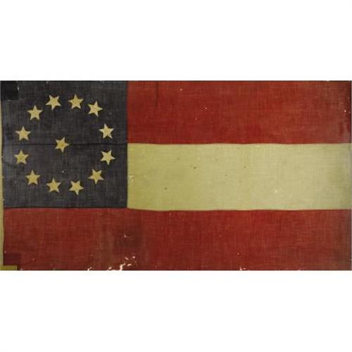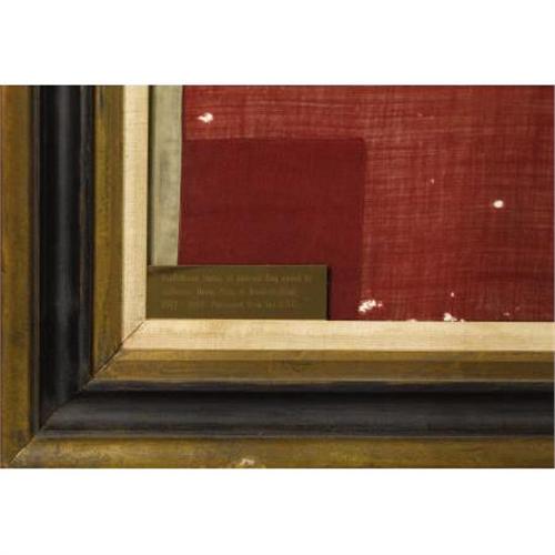 <B>JEFFERSON DAVIS: FIRST NATIONAL PATTERN CONFEDERATE FLAG THAT FLEW OVER HIS HOME, </B></I><B><I>BEAUVOIR</B></I></B></I><B>, AFTER THE WAR.</B></I> A post-war "Stars and Bars" flag with fourteen stars on the blue canton. Made of wool, machine sewn, with a canvas lanyard. Written in old ink on the staff side is "Beau Voir 1867-1908". The flag measures 106" x 56". There is minor moth damage to the bottom stripe; otherwise, it is in excellent condition with good strong colors. Mounted into a large walnut museum frame and ready for display.<BR><I><BR>Beauvoir</B></I> , where this flag proudly flew, was the post-war home and library of Confederate President Jefferson Davis at Biloxi, Mississippi. Originally built on 600+ acres in 1848 by a planter from Madison County, James Brown, it was never used as a plantation due to bad soil. It served as the family's coastal home with a "beautiful view" (thus <I>beau voir</B></I>) of the Gulf of Mexico. Davis rented one of the cottages there to work on his book, <I>The Rise and Fall of the Confederate Government</B></I>. He brought his son there to help with the writing and eventually his wife also moved in and grew to love living on the coast. Davis eventually bought the property and lived there until his death in 1889. He willed <I>Beauvoir</B></I> to his youngest daughter Winnie and upon her death in 1898, the house reverted to Davis's widow Varina. In 1902, Mrs. Davis sold much of the property to the Mississippi division of the Sons of Confederate Veterans for use as a home for Confederate veterans and widows and as a monument to Jefferson Davis. In 1941, the main house was opened for public tours and eventually, a Confederate museum, a Tomb of the Unknown Confederate Soldier, and a Presidential Library were added. Sadly, the home and contents were seriously damaged by Hurricane Katrina in 2005. Restoration is ongoing.<BR><BR>This flag made its way from the SCV in Biloxi to the United Daughters of the Confederacy in Richmond likely for the Jamestown Exposition and the dedication of the Jefferson Davis Monument. They held this flag until noted Civil War collector and author William Albaugh III purchased it from them in 1966. The current consignor purchased the flag shortly thereafter. Included with this lot are several letters of documentation by Albaugh.<BR><BR>This flag has been carefully examined by authoritative in-house experts and has been deemed to be authentic and of the period in every respect including fabric, thread, dye and the method and pattern of construction. Additionally, any accompanying provenance has been verified as unique and indigenous to the specific flag it documents.<BR><BR><b>Shipping:</b> Requires 3rd Party Shipping (<a target="_blank" href="http://www.heritageauctions.com/common/shipping.php">view shipping information</a>)