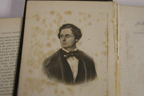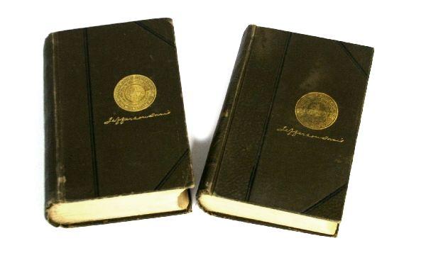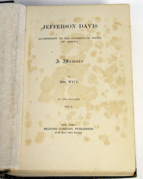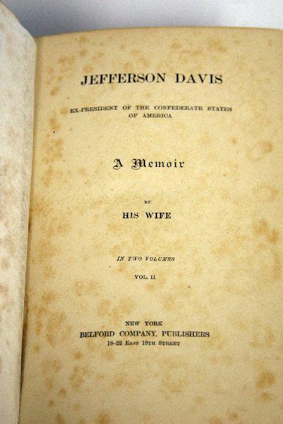 2 volume memoir about Jefferson Davis entitled "Jefferson Davis Ex-President of the Confederate States A Memoir by His Wife". Copyright Varina Jefferson Davis, 1890 and published by the Belford Company. Volume 1's binding is slightly pulled apart in the f