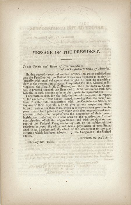 Rare Confederate imprint, Message of the President. To the Senate and House of Representatives of the Confederate States of America., 4pp. 8vo., [Richmond, 1865], the text of Davis Feb. 6, 1865 submission of the report of the "Peace Commissioners" following his unsuccesful attempt to have emissaries discuss peace terms with Lincoln three days earlier. Davis had appointed a Alexander Stephens, Robert M.T. Hunter, and John A. Campbell to go to Hampton Roads to meet with Secretary of War William H. Seward to discuss peace terms. Abraham Lincoln joined the meeting at the last moment. Hunter proposed an armistice and a convention of states. No armistice, said Lincoln; surrender was the only means of stopping the war. Lincoln insisted on the abolishment of slavery, but offered up to $400 million to recompense slave owners. Whatever their personal preferences, the commissioners had no power to negotiate such terms. They returned to dejectedly to Richmond. In his submission, Davis claims that the union demanded "unconditional submission to their rule...emancipation of all the negro slaves...the right on the part of the Federal Congress, to legislate on the relation between the white and black population...". The commissioners' report makes note of the fact that Lincoln refused to accept the Confederacy's continued existence as a sovereign nation, but did note that he would treat federal lawbreakers with as much leniency as possible. Also published is an extract of Lincoln's statement of Dec. 1, 1864 in which he set forth his opinion as to what conditions would be required for peace withthe southern states. Fine. Sold with a scarce Confederat eimprint, 1p. 8vo., Richmond, dec. 16, 1864, a Confederate House Resolution authorizing Jefferson Davis to appoint 13 commissioners, "one from each of the Confederate States", to negotiate peace. That failing, they are to make efforts to obtain an immediate exchange of prisoners and discuss a way to mitigate the war's "horrors and atrocities". The terms Lincoln set enraged Southerners, and provoked them to remain in the war for more than a year more...costing many thousands more dead.