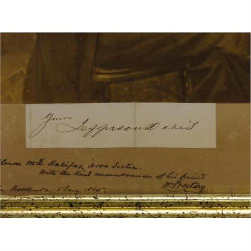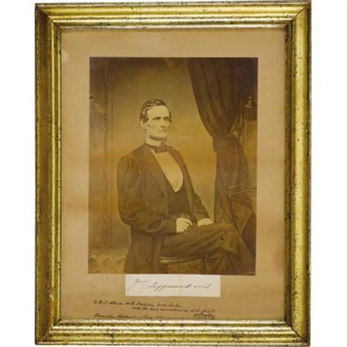 <B>PRESIDENT JEFFERSON DAVIS SIGNED LARGE PHOTOGRAPH - BERMUDA 1865 ALSO SIGNED BY CONFEDERATE SECRET AGENT GEN. WILLIAM PRESTON AS EMISSARY TO ARCHDUKE MAXIMILIAN</B></I>. A rare large albumen photograph of the Confederate president in original gold gilt frame, 15.5” x 19.5”, taken from life by C. R. Rees in Richmond, Va., ca. 1863, with large signature of President Davis mounted beneath. This rare photograph portrait was hand carried by Confederate General William Preston on his secret mission to establish diplomatic relations with Archduke Maximilian, who had just been appointed the Emperor of Mexico. Beautifully presented by Gen. Preston in Hamilton, Bermuda, on January 5, 1865. A quadruple rarity, as the photograph is a great rarity by itself, the fact that it was presented by a Confederate general while on a secret diplomatic mission and being presented in Hamilton, Bermuda, an important Confederate blockade-runner port, and lastly to a Confederate secret agent in Canada makes it especially desirable. <BR><BR><B>Provenance:</B></I><I> William Albaugh Collection, </B></I>author of <I>Confederate Weapons</B></I> and <I>Confederate Faces.</B></I><BR><BR><B>Condition:</B></I> Fine, good contrast, has some discoloration on card .<BR><BR><b>Shipping:</b> Framed - with Glass, Small (<a target="_blank" href="http://www.heritageauctions.com/common/shipping.php">view shipping information</a>)