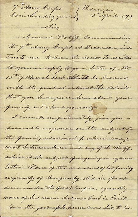 (1808 - 1889) President of the Confederacy who led his armies beyond the surrender at Appomattox. A.L.S. signed "J.D." in the postscript only, 1p., 8vo, April 10, 1879, written on both sides to a fellow army officer on his commanding officer's behalf. In part: "General Wolff commanding the 7th Army Corps...instructs me to have the honor to write to you in reply to your letter...he has read with the greatest interest the details that you have given him about your family and about yourself. I cannot unfortunately give you a favorable response on the subject of the family relationship which may exist between him and any of the Wolff, which is the subject of inquiry in your letter. None of the members of his family originally of Burgundy did in fact serve under the first empire, equally none of his name has ever lived in Paris". Davis adds in his postscript: "Doubting whether I have discyphered [sic] the signature of the acting officer, and having made a full translation to bring the letter into English usage, I have thought it well to return the original to you."Vertical mailing fold, light soiling, else very good.