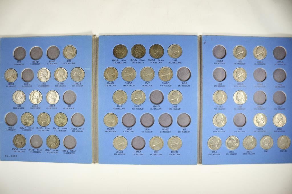 COINS WHICH INLCUDES 8 35% SILVER JEFFERSON WAR NICKELS IN WHITMAN ALBUM
