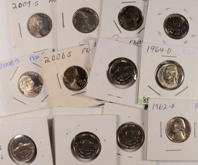 JEFFERSON NICKEL LOT, 12 PROOF MIXED DATES, 3 BU, 62, 64-D, 88D