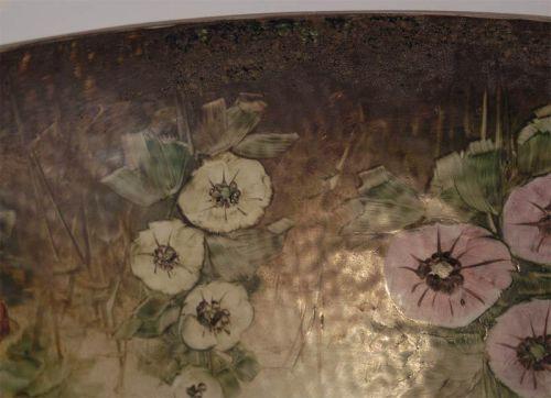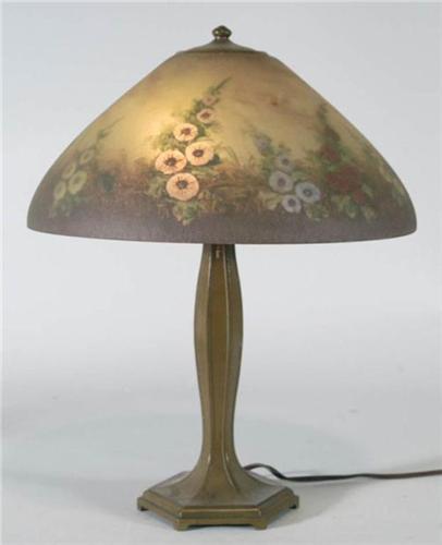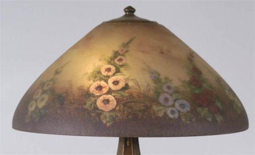 JEFFERSON REVERSE PAINTED LAMP decorated with hollyhocks 18" diameter, signed indistinctly, CONDITION: excellent, no damage or repairs, wiring old and should be replaced. PACKING AND SHIPPING BY FAIRFIELD AUCTION WITHIN CONTINENTAL USA (excluding insurance) $125,