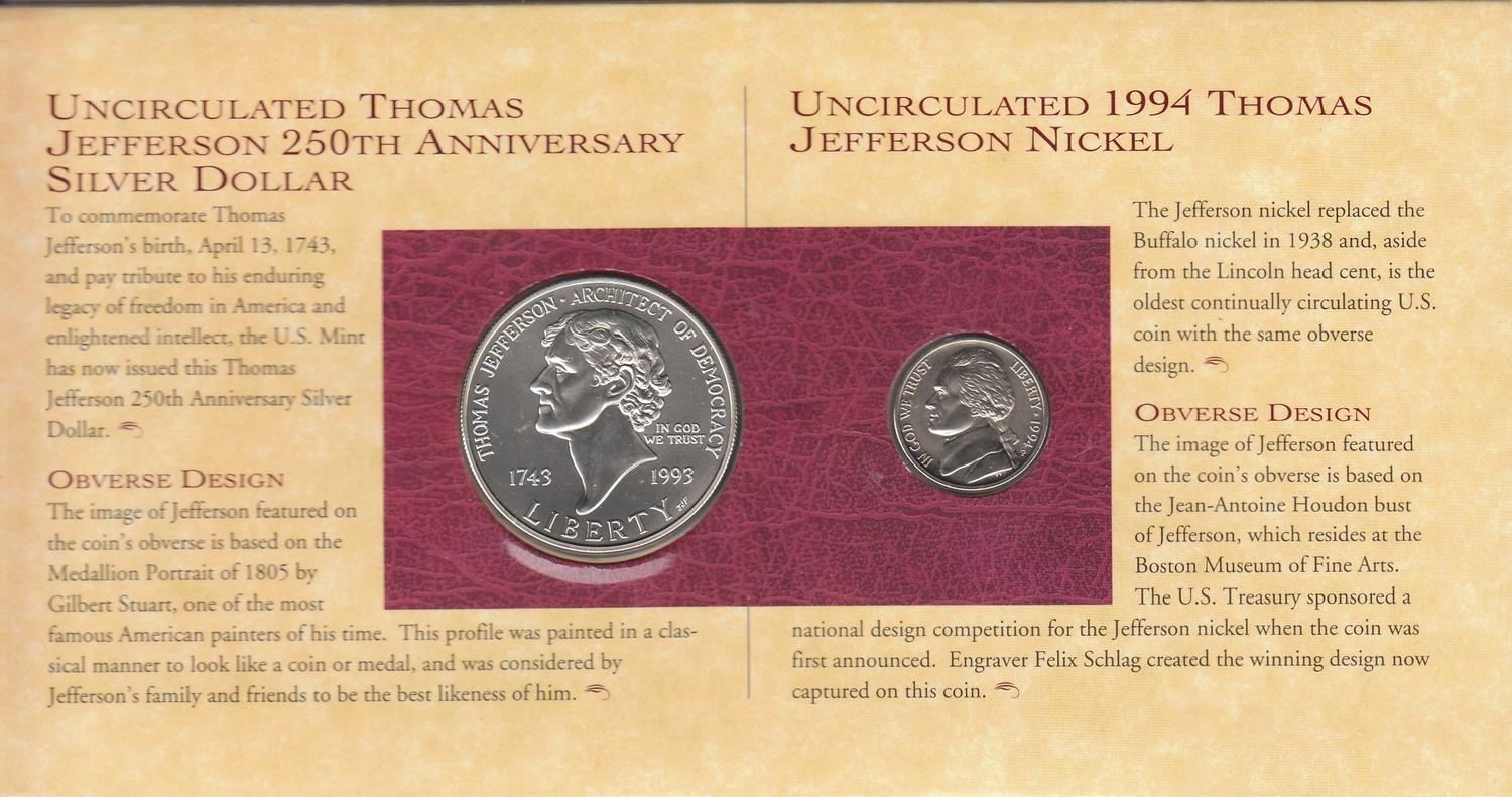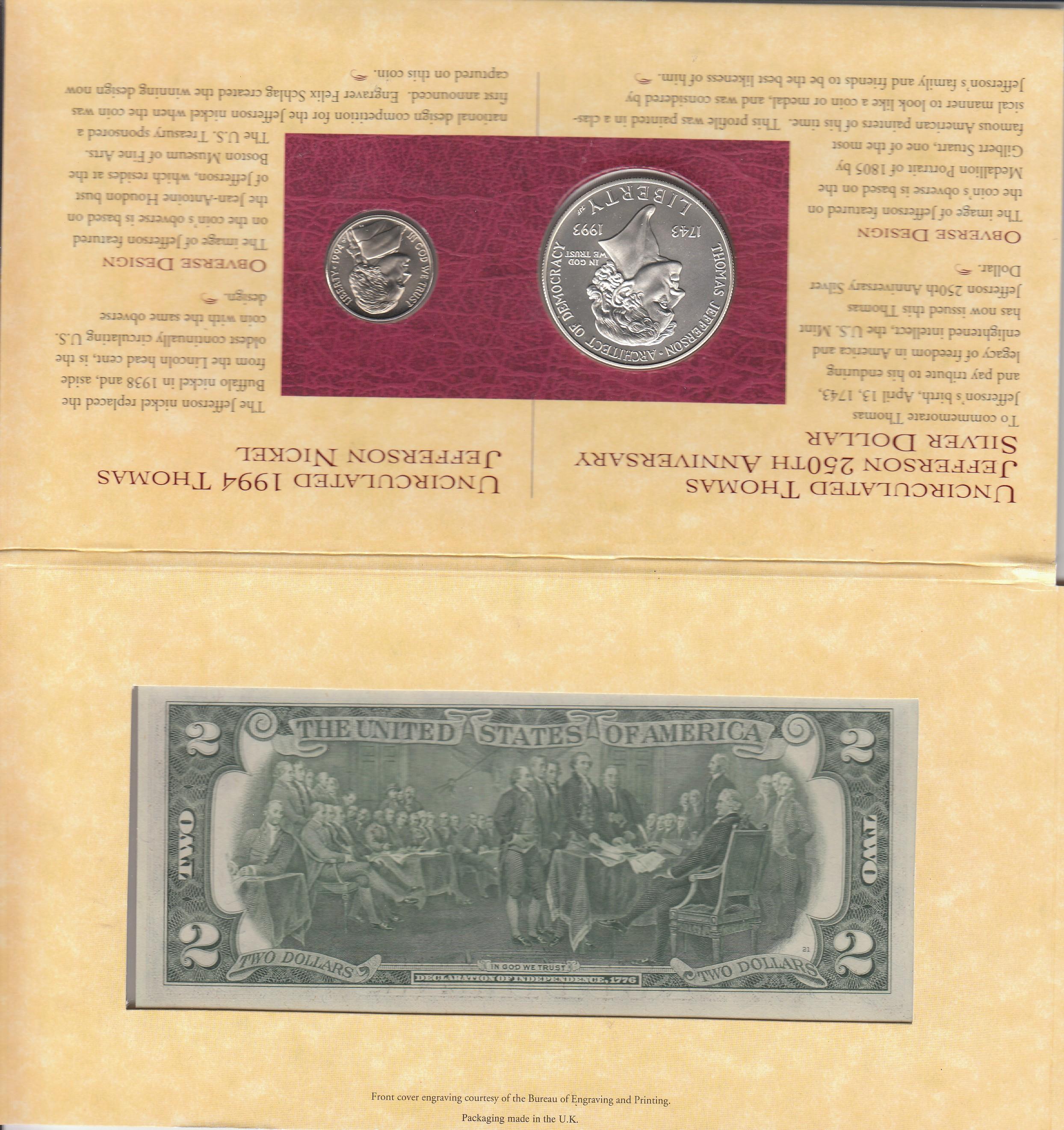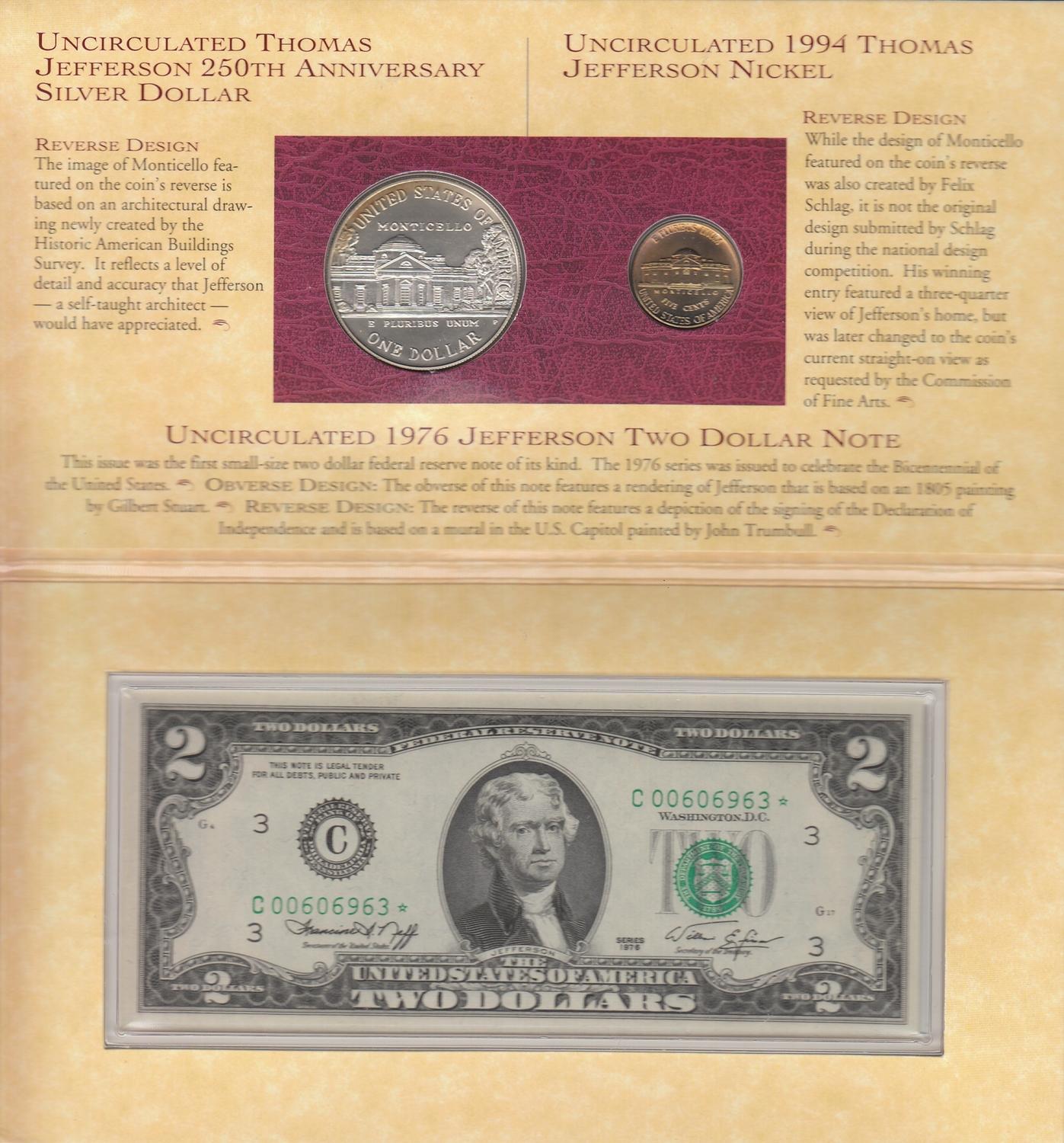 GEM UNCIRCULATED...INCLUDES ALL ORIGINAL MINT PAPER WORK WITH A JEFFERSON SILVER COMMEMORATIVE $1 AND A STAR $2 1976 BICENTENNIAL NOTE MINT ISSUE. THERE IS A TAPED TEAR ON THE BACK OUTSIDE COVER