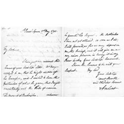 JEFFERY AMHERST: (1717 - 1797) British Major General who captured Louisbourg from the French in 1758. Served as Governor General of British North America but left the office due to Pontiac's Rebellion and later served as colonial Governor of Virginia. A.L.S. 2pp. 4to., [London], May 1, 1790 to the Marquis of Buckingham concerning an officer's commission. Amherst writes in part: "...Mr. Morgan applied to me that he might dispose of his commission, and I wished to have the particulars of what he gave that I might consistently, with the rules of service, to promote his request..." Usual folds, otherwise very good. $300-500