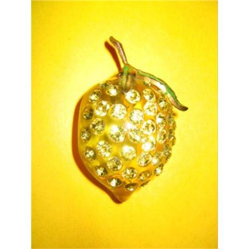 JELLY BELLY LEMON LAPEL PIN, FRONT COVERED WITH RHINESTONES, THE TOP LEAFS ARE MADE OF METAL WITH GREEN ENAMEL TO RESEMBLE LEAFS,, WHAT A GREAT PIECE.