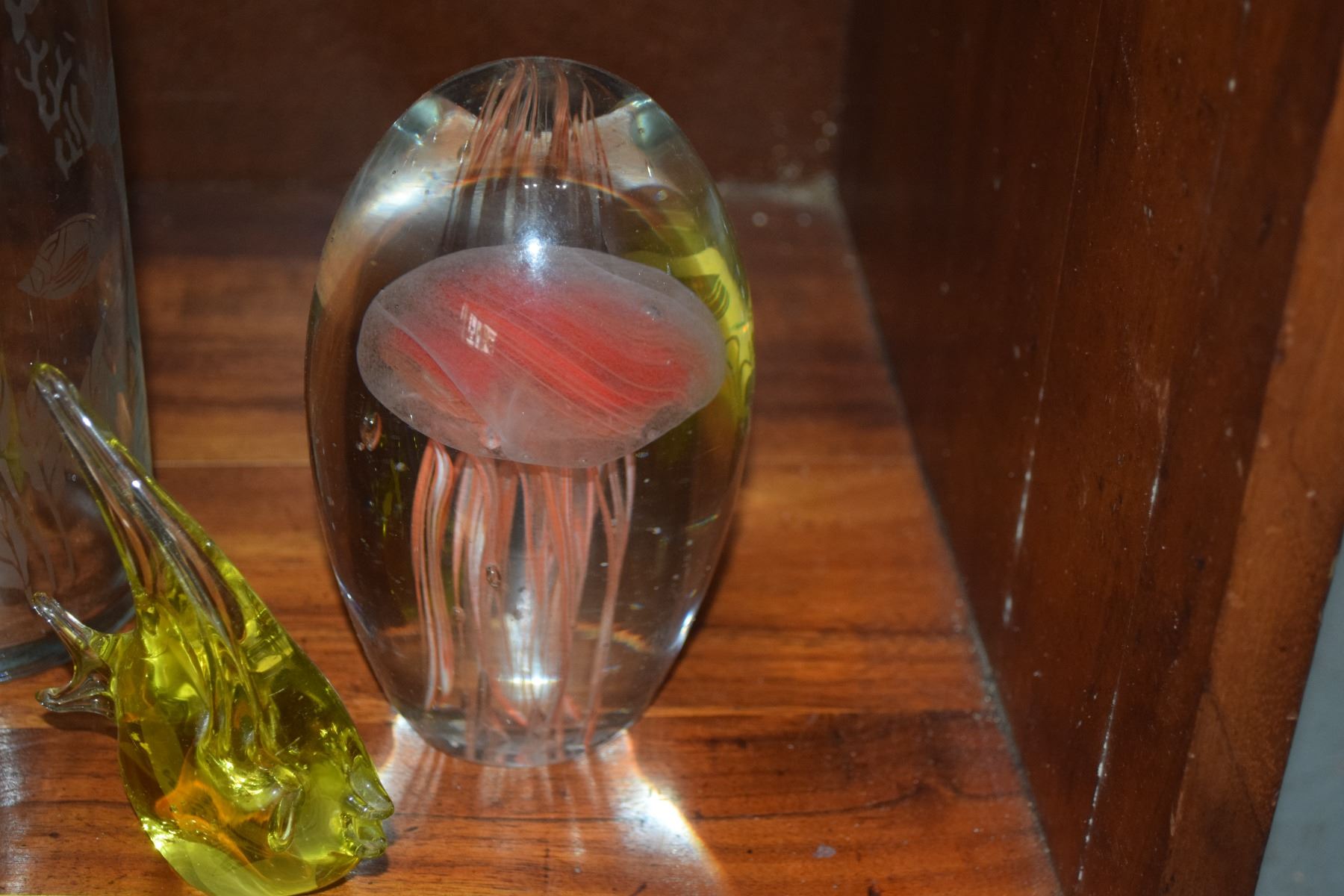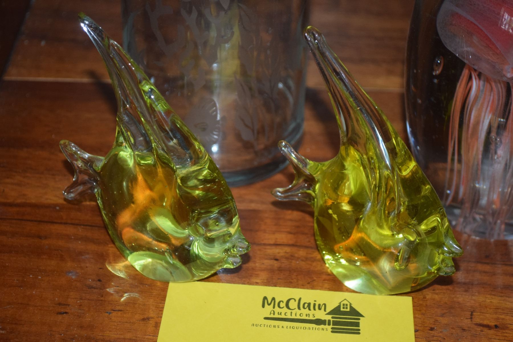 JELLYFISH PAPERWEIGHT, GLASS VASE W/FISH MOTIF & GLASS FISH SCULPTURES (4 PCS)