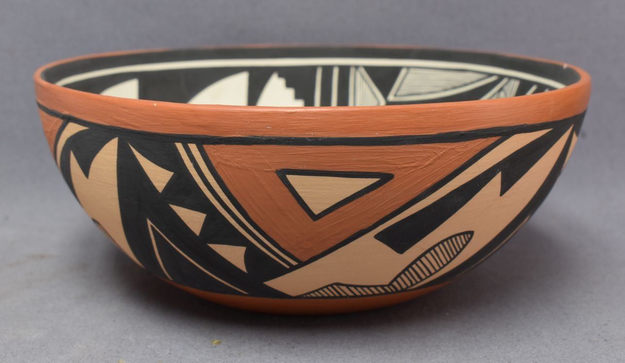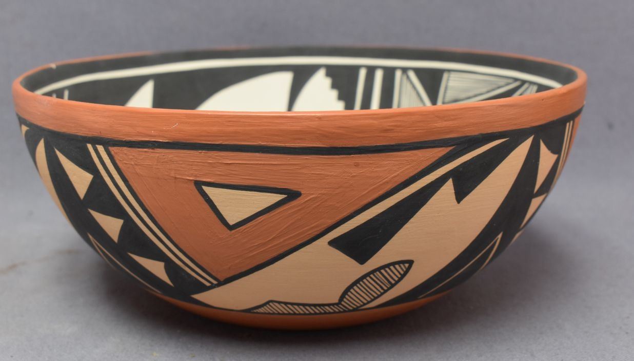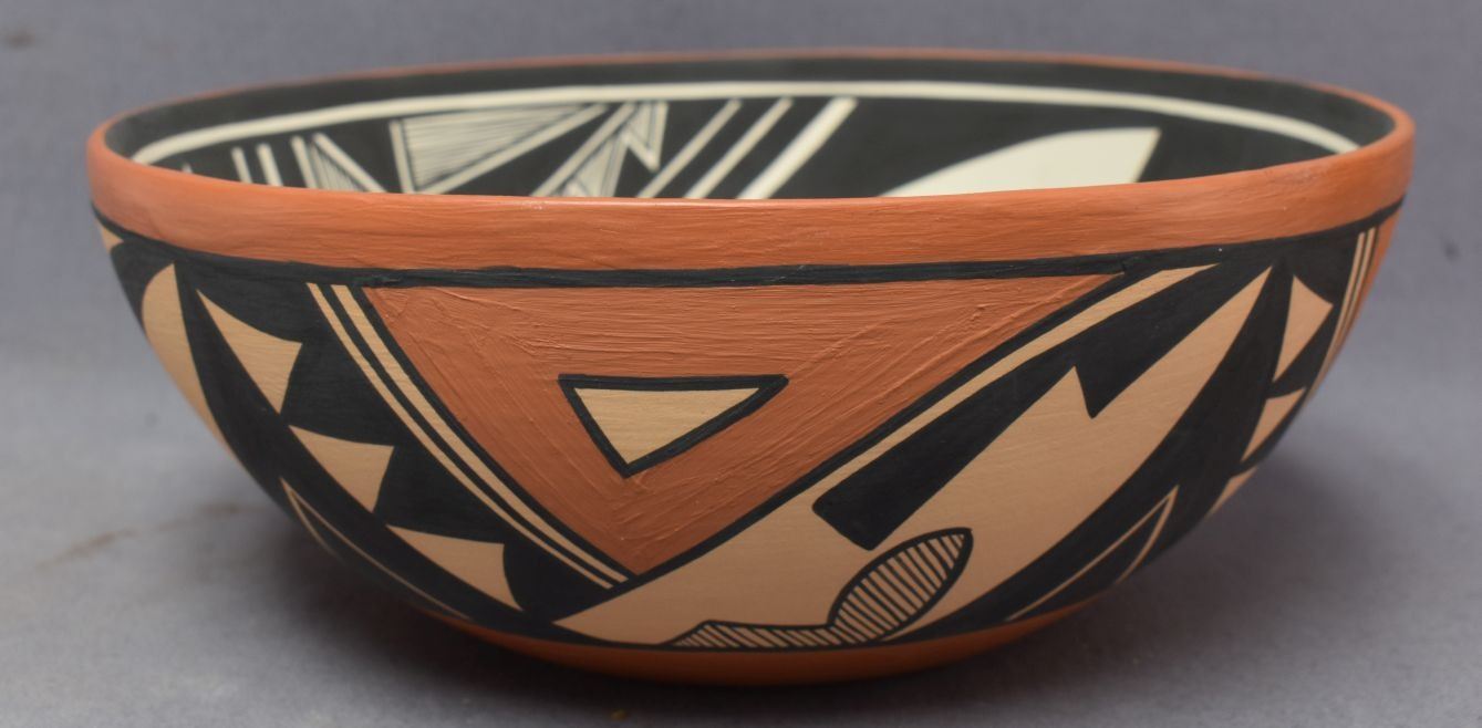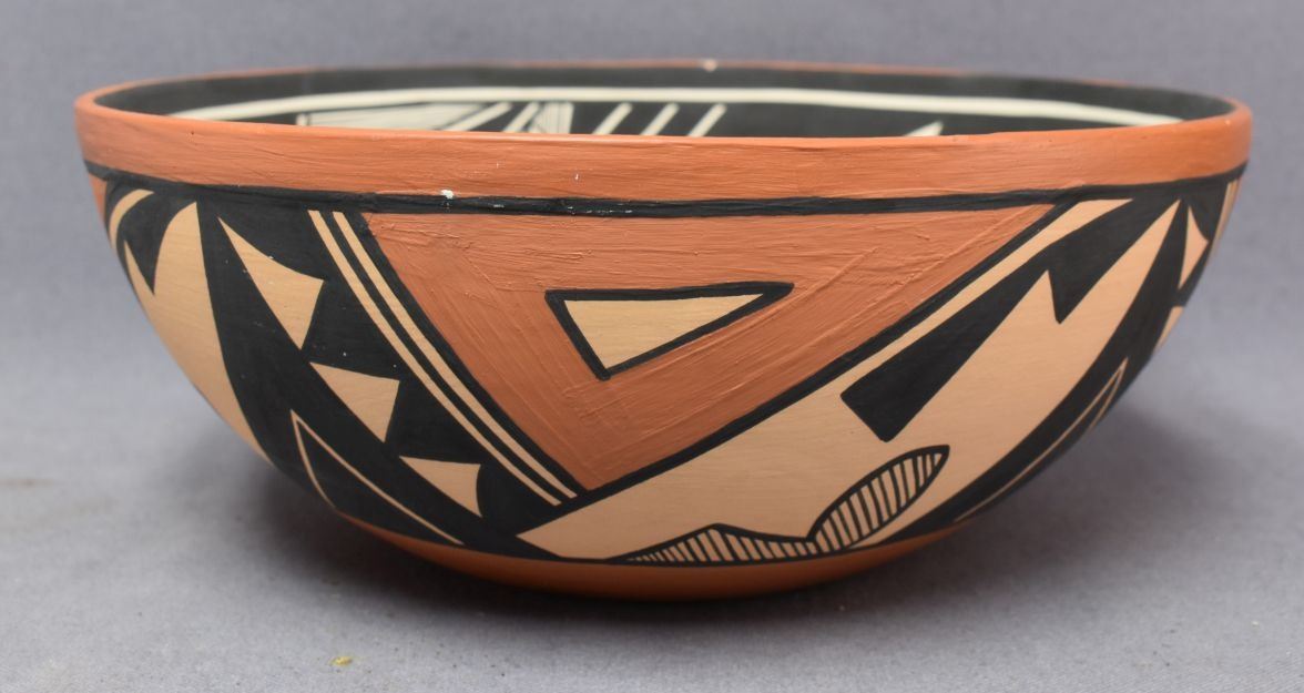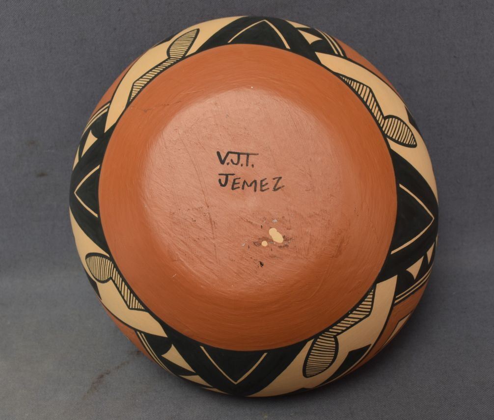 1990's Jemez Indian. Hand coiled and painted design pottery bowl, signed V.J.T. 4'' x 10''