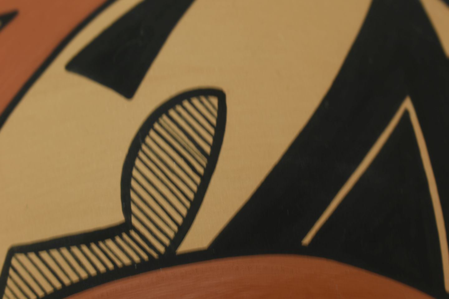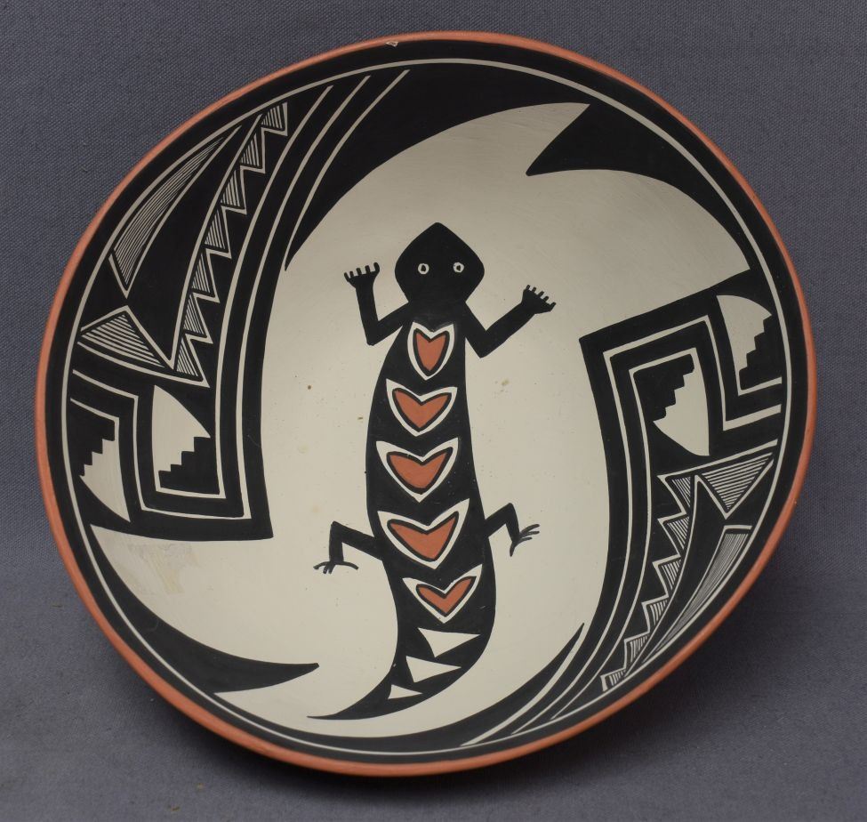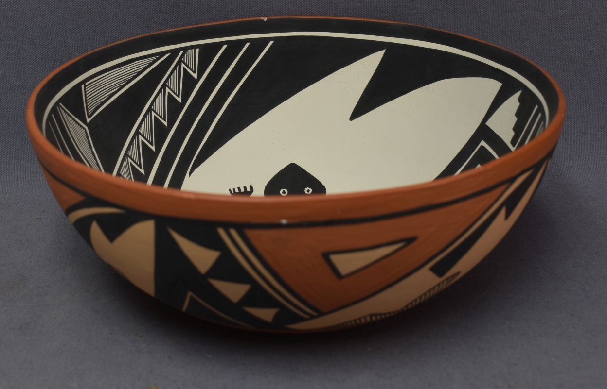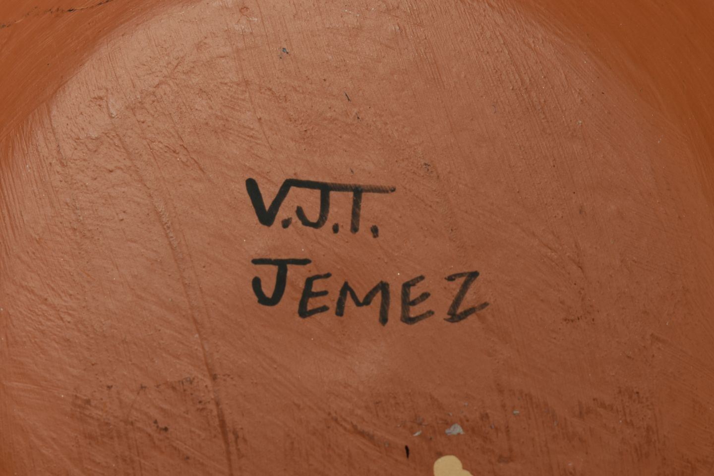 1990's Jemez Indian. Hand coiled and painted design pottery bowl, signed V.J.T. 4'' x 10''