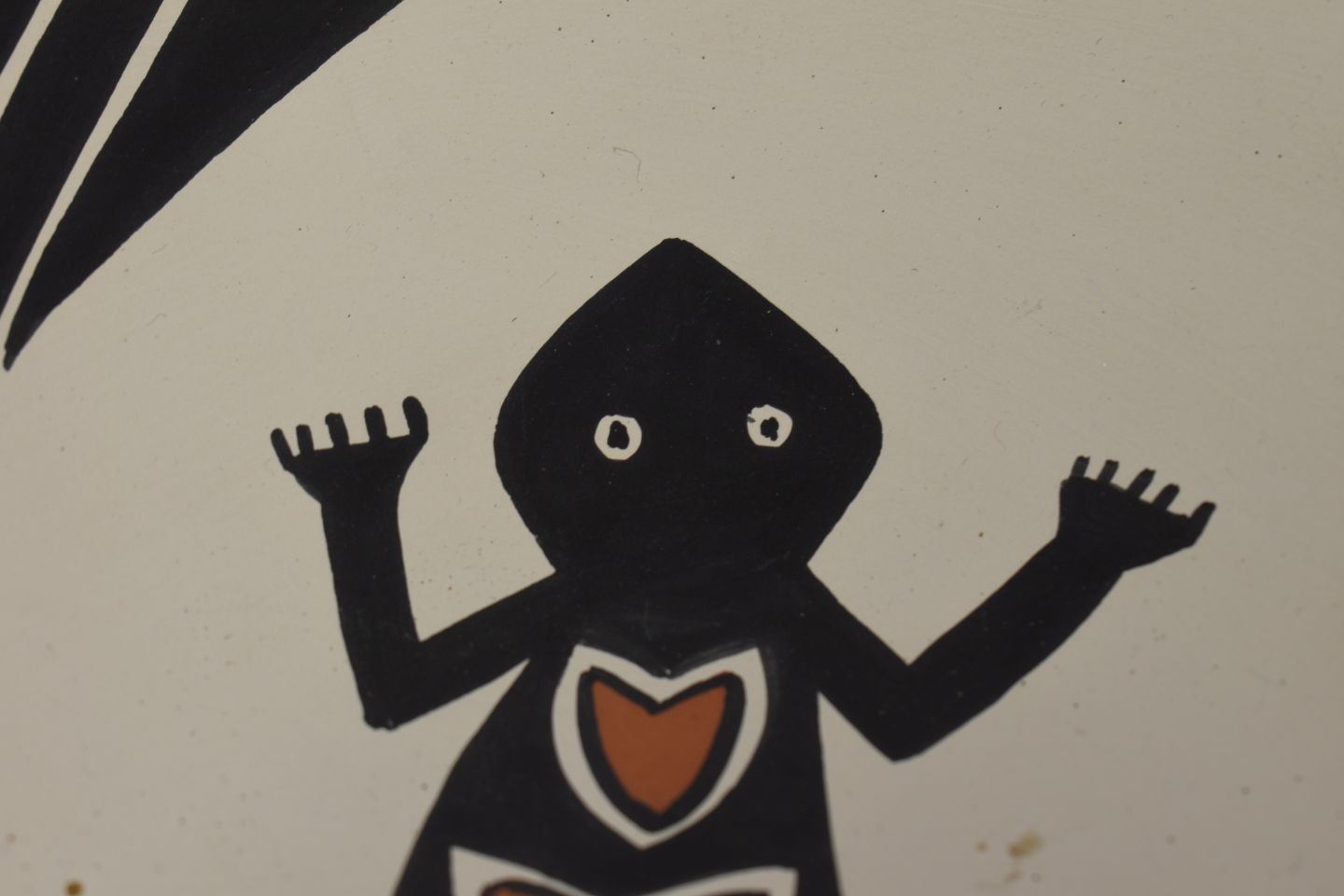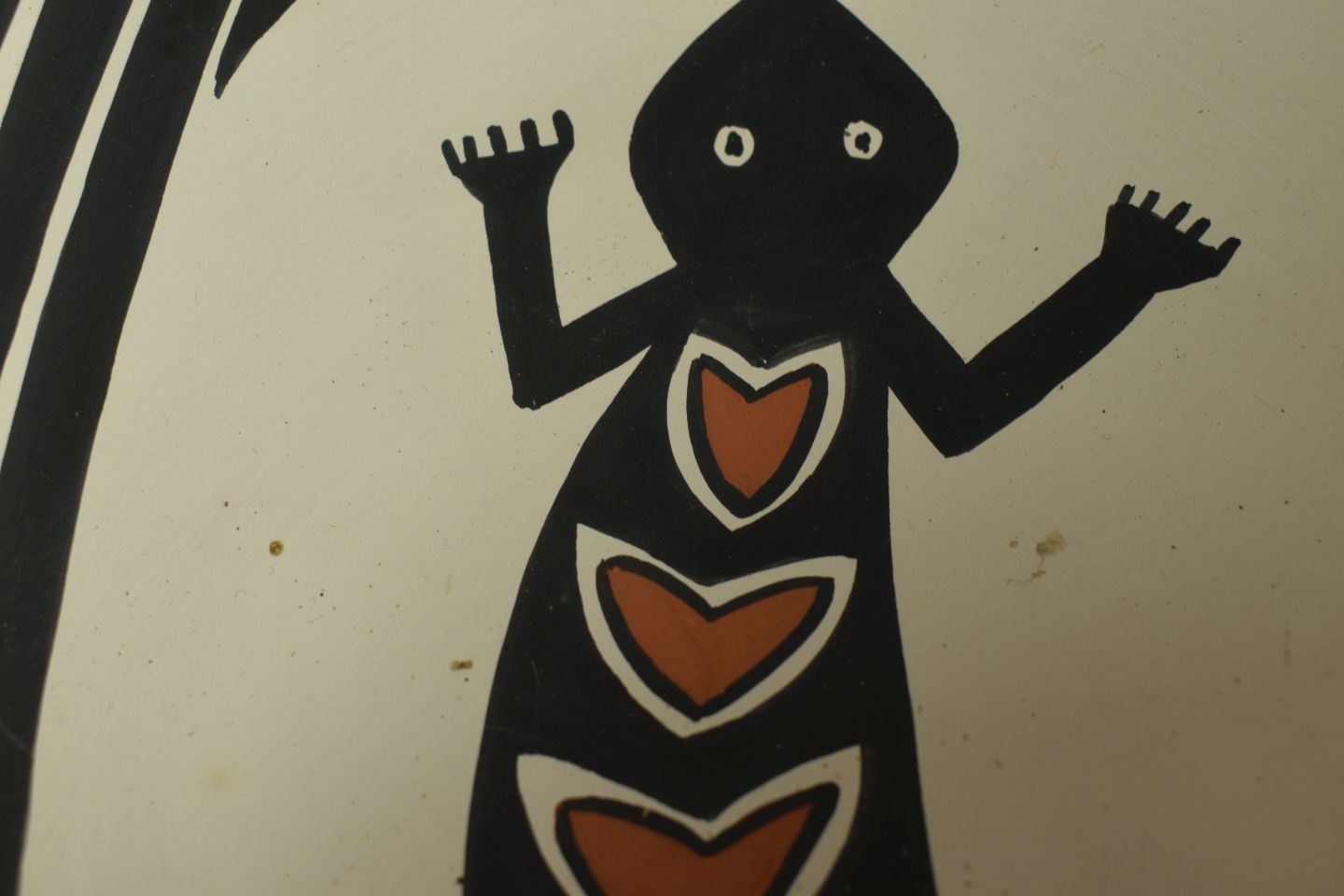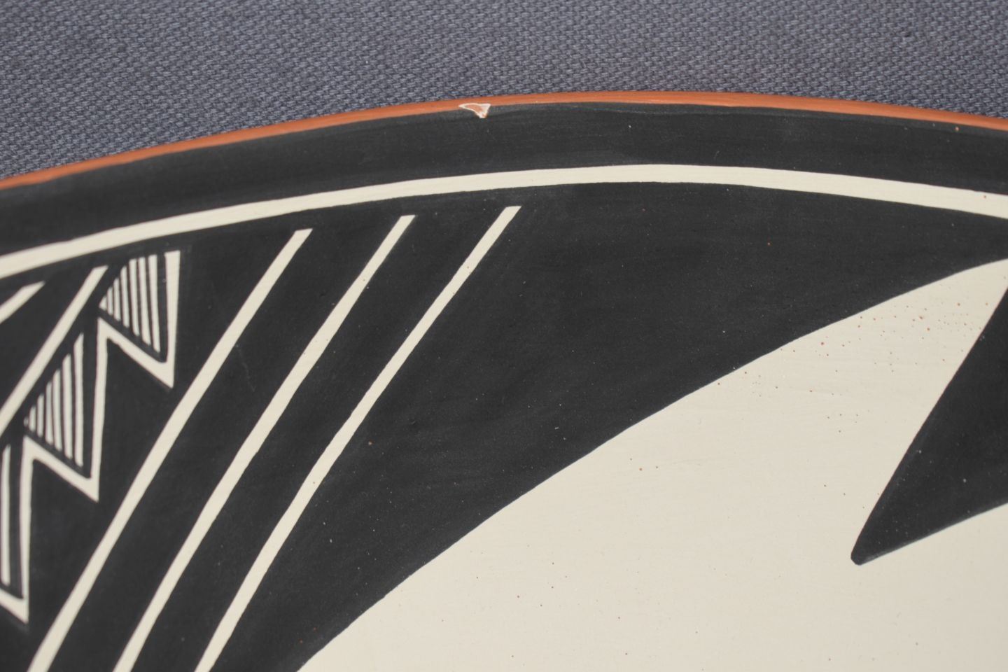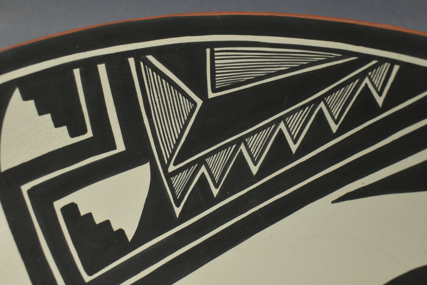 1990's Jemez Indian. Hand coiled and painted design pottery bowl, signed V.J.T. 4'' x 10''