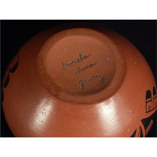 POTTERY: Two pottery vessels to include Jemez pot with black painted asymmetrical decoration, note nick, 3.25'' H x 5.5'' D; Casas Grande Mexican pot, unsigned, asymmetrical applied banded design, 6'' H, 5.5'' D at widest point.