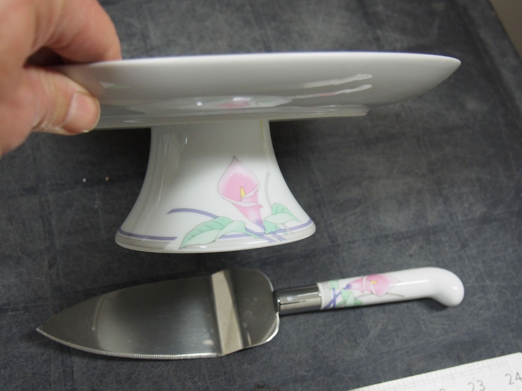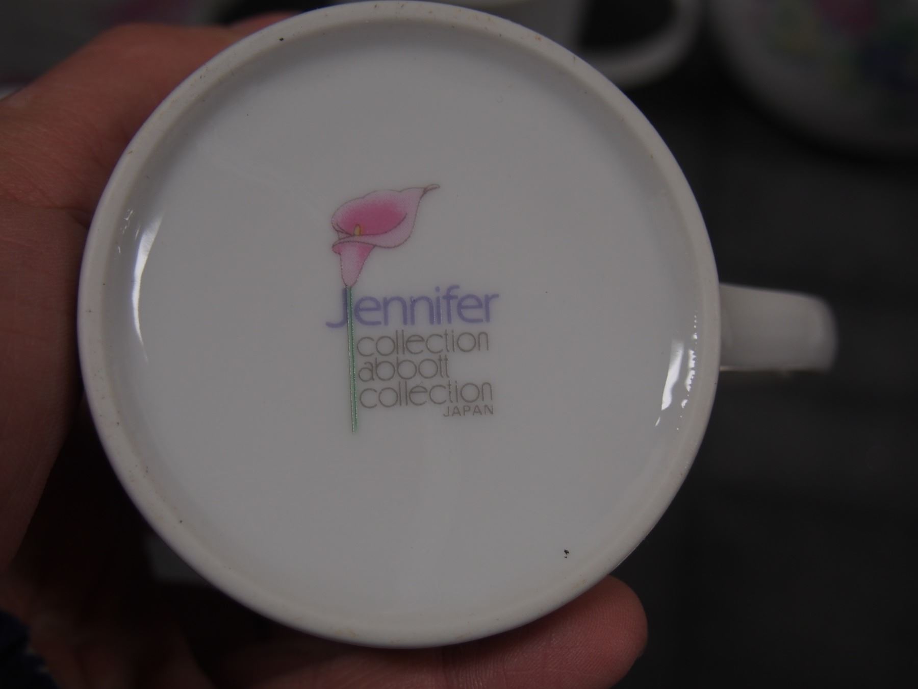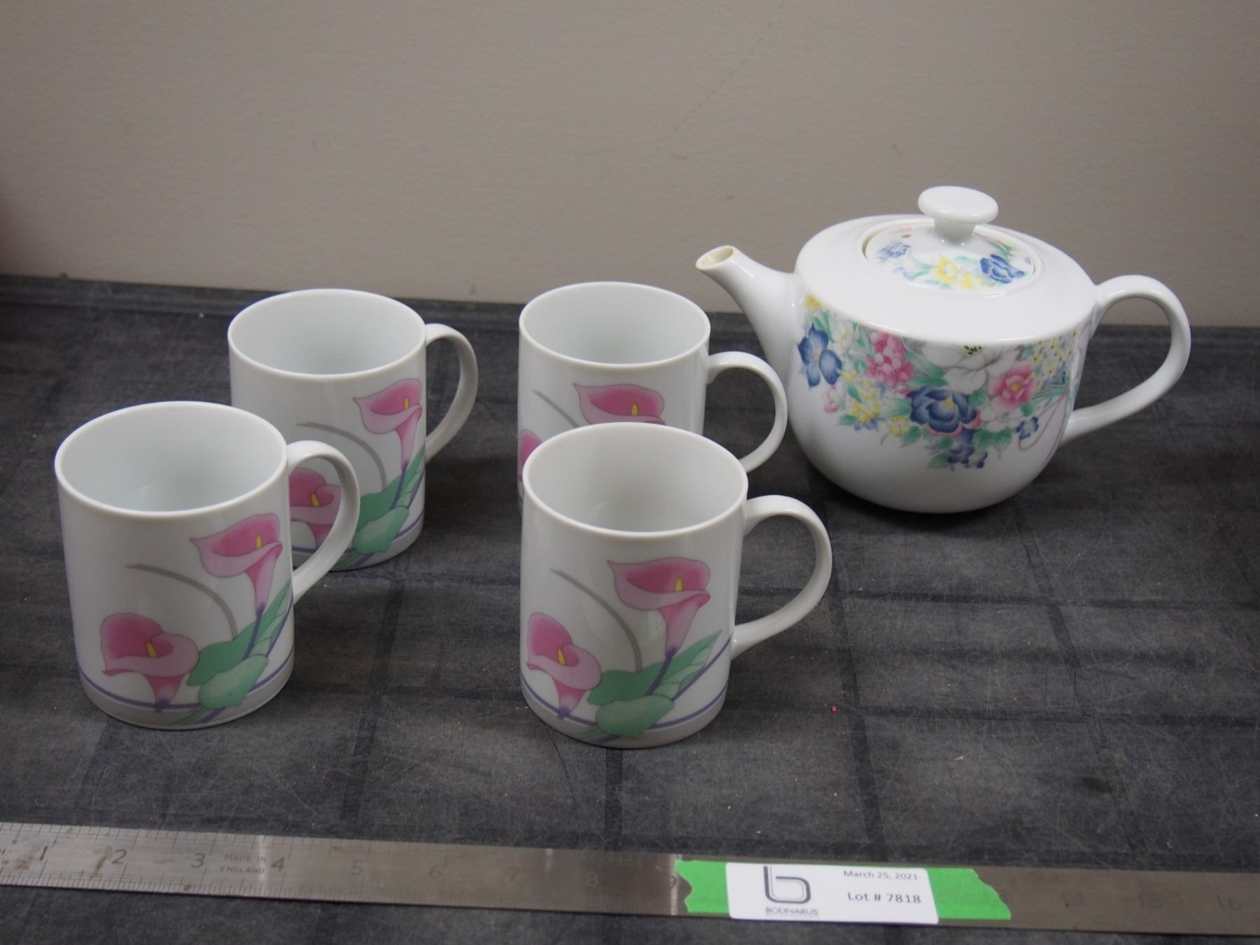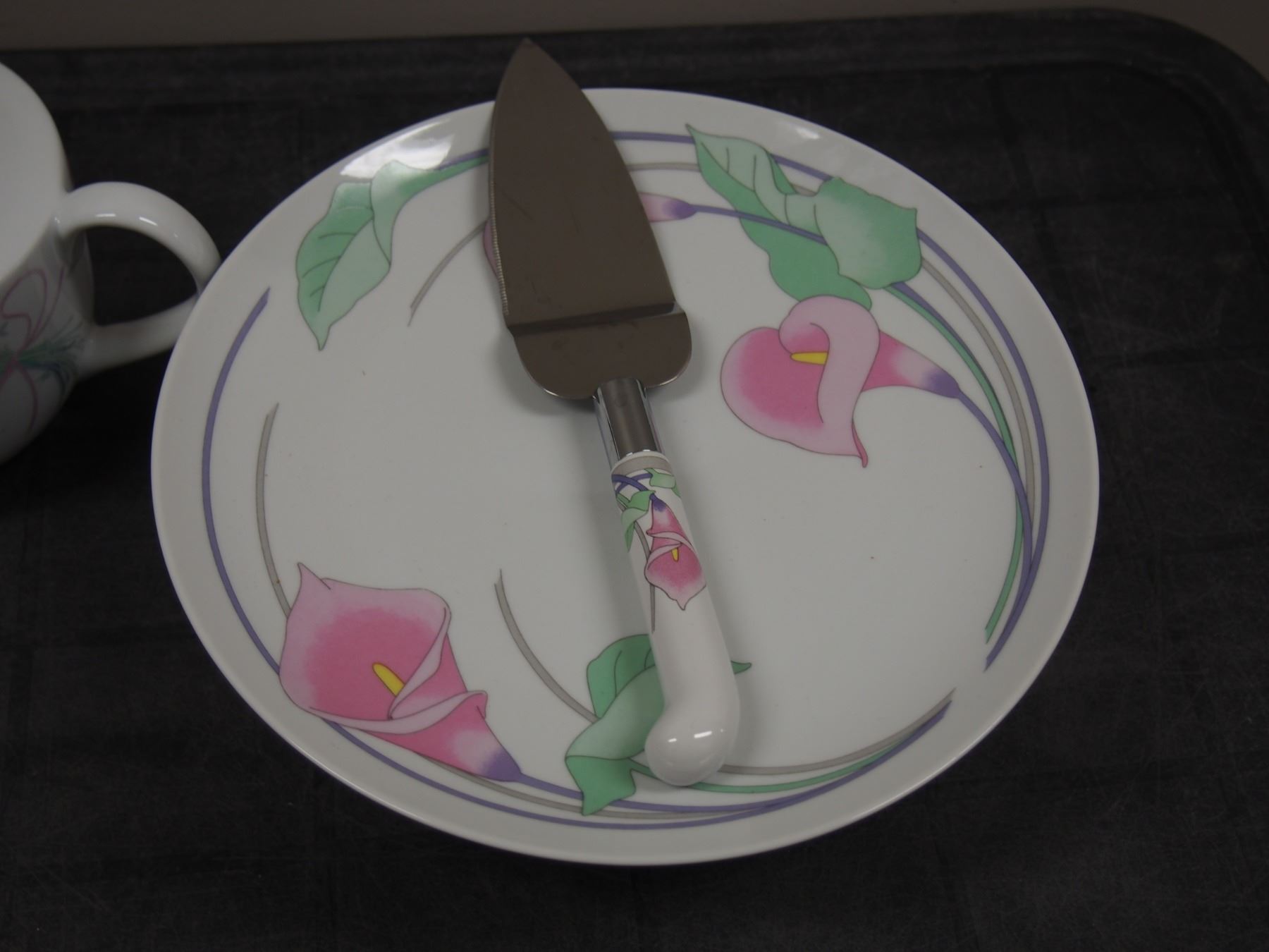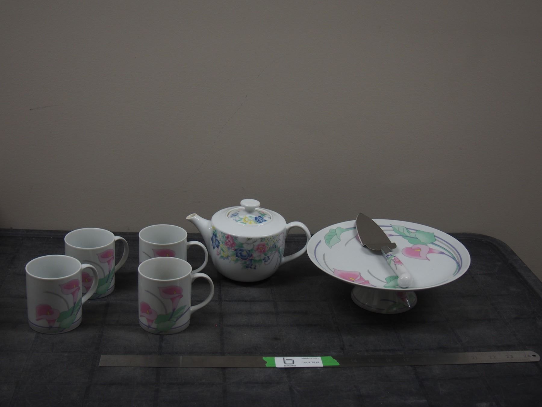 JENNIFER ABBOTT COLLECTION, CAKE SERVING TRAY, KETTLE & COFFEE CUPS (LIKE NEW)