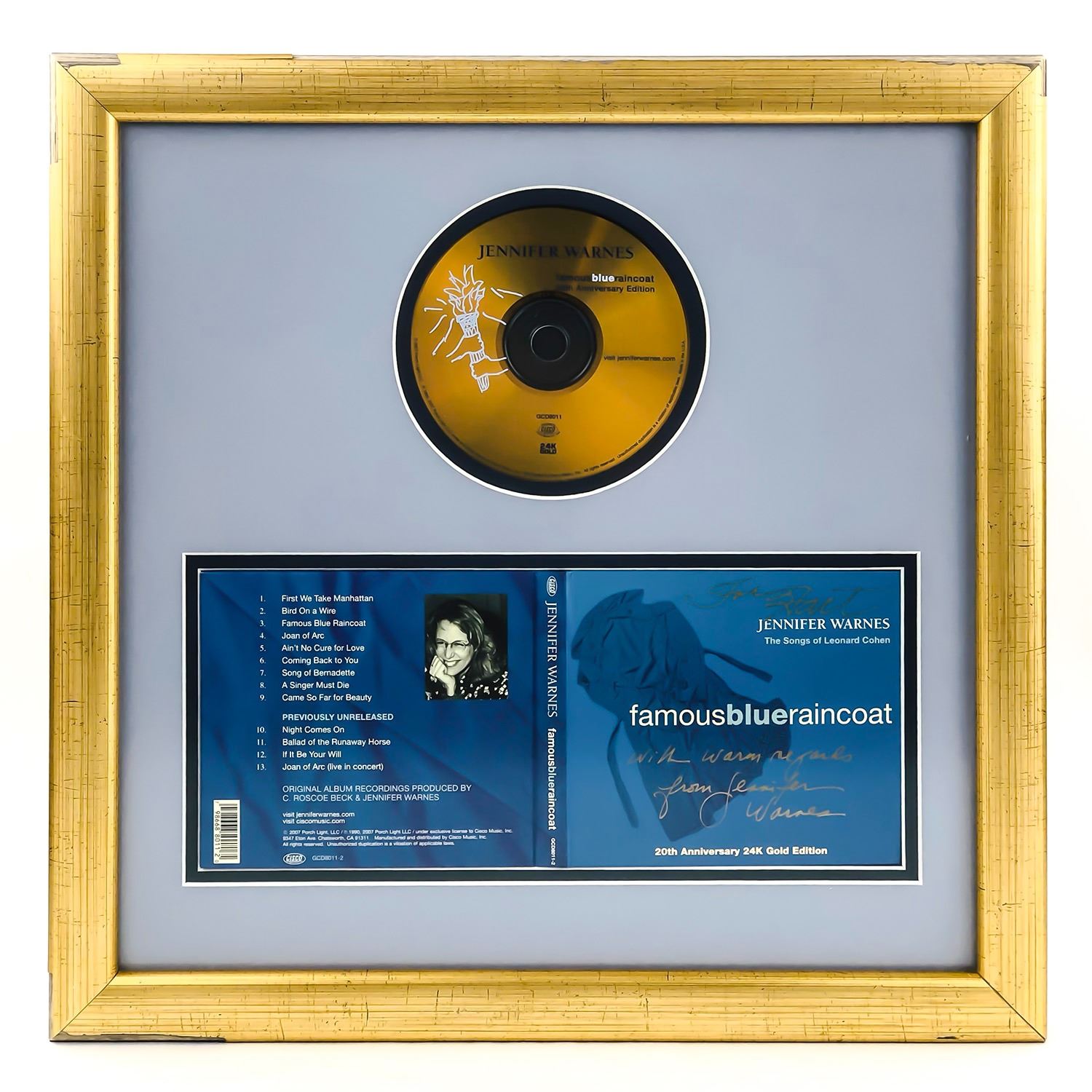 #9231 - JENNIFER WARNES FAMOUS BLUE RAINCOAT - 20TH ANNIVERSARY EDITION - 24K GOLD CD, FRAMED AND UNDER GLASS, FRAME MEASURES: 16.5” (42 CM) SQUARE***ITEM(S) LOCATED IN LETHBRIDGE ALBERTA. ALL ITEMS IN THIS AUCTION QUALIFY FOR OUR FREE TRANSPORT TO EDMONTON SERVICE. WORLDWIDE SHIPPING AVAILABLE