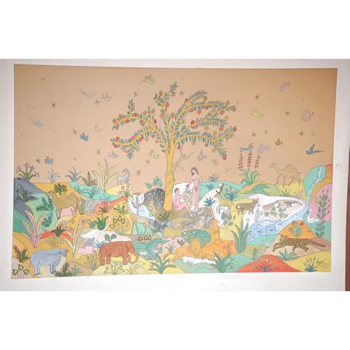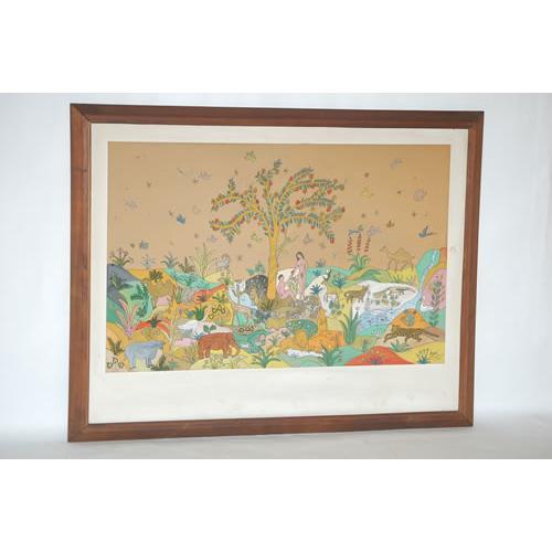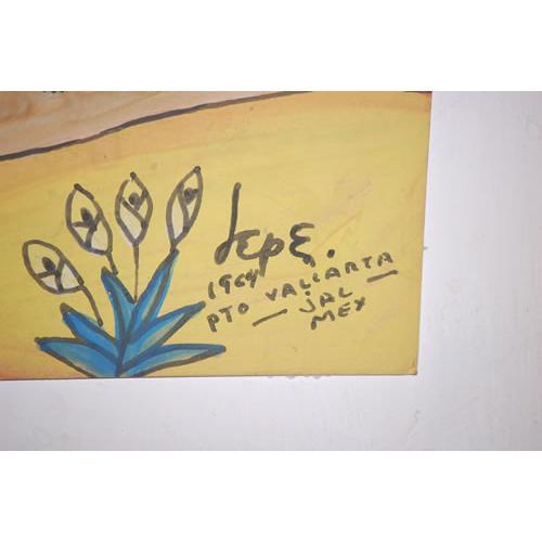 JEPE WATERCOLOR ON ARTISTS BOARD PAINTING LG. MEXICAN FOLK ART VIEW OF ADAM & EVE IN GARDEN OF EDEN W/ FIG LEAF, APPLE & SERPENT-SIGNED JEPE? 1964 PTO VALLARTA JAL-MEX ON LOWER RIGHT, MATTED & FRAMED (28" X 44") - WEAR, SOILING & SPOTS, IMPERFECTIONS