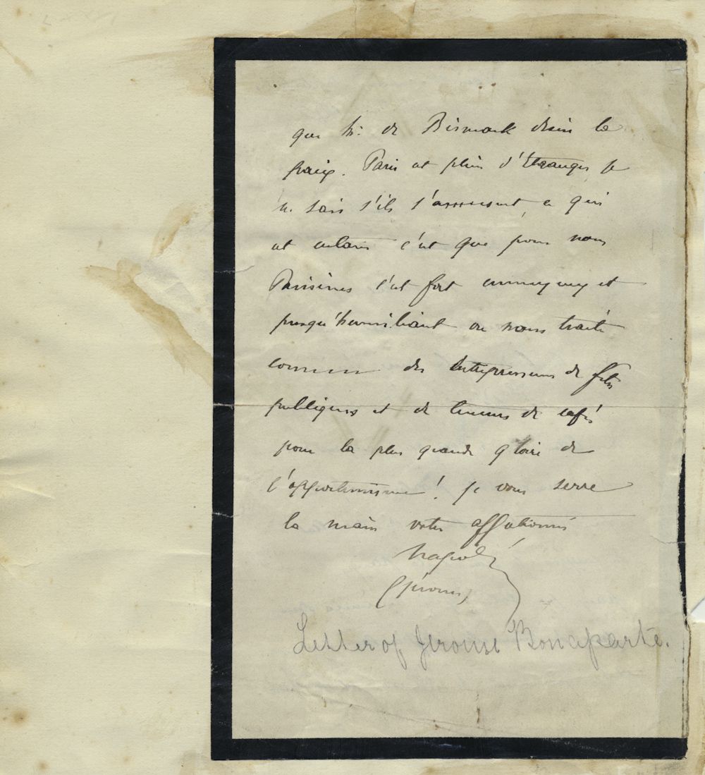 JEROME BONAPARTE (1784 - 1860) French marshal and brother of Napoleon, distinguished himself at Waterloo and in 1852 was made President of the French Senat. Partial A.L.S. "Napoleon", 1p. 8vo. [n.p., n.d.], in French. Largely untranslated but mentioning Bismarck and "Paris is full of strangers...". Mounted to an album page, some glue traces and an ink notation at bottom of page. The verso of the page bears a signature of GIUSEPPE MAZZINI "Joseph Mazzini". Overall good to very good.
