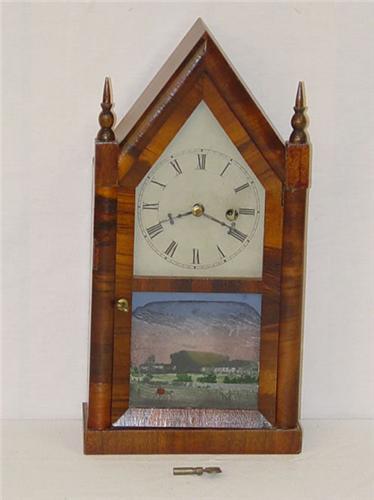 JEROME & CO. MAHOGANY VENEER STEEPLE CLOCK W/ REVERSE PAINTED LOWER TABLET OF PUBLIC BUILDING - LOSSES TO PAINTING & VENEER, IMPERFECTIONS