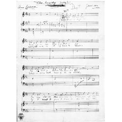 <b>454. JEROME KERN</b> (1889 - 1945)<b> </b>American composer best known for his scores for musical comedies (<i>Showboat</i>), and songs such as "Old Man River" and "Smoke Gets In Your Eyes". Rare and most desirable A.Ms.S., 4pp. folio, [n.p., n.d. but ca. early 1920s], an ink handwritten musical score for his vocal duet originally entitled "<i>The Ship's Bell</i>" in the hand of Kern, crossed out and re-titled "<i>The Lovely Lorelei</i>", and signed "<i>Jerome Kern</i>" at the upper-right corner of the first page. The score's new title is in the hand of noted lyricist <b>ANNE CALDWELL </b>(1876 - 1936), with whom Kern collaborated on many recordings such as Night Boat, and she additionally signs at upper-left "<i>Anne Caldwell</i>". Obtained by us from a direct descendant of noted musical director and conductor Victor Baravalle (1885-1939). Baravalle collaborated closely with Kern, serving as musical director and conductor for the original 1927 Broadway production of "Show Boat", as well as the 1936 film of the same name. Indeed, a 1932 <i>Variety</i> article notes that Baravalle collaborated closely with Kern since 1916, and adds: "...Kern depends so much on Mr. Baravalle that he insists on this gentleman directing every musical show that he writes...". Apparently unpublished, this song was likely used during a benefit performance at the Metropolitan for the Actors Equity Association or Lamb's Gambol, N.Y.C., where it would have been conducted by Baravalle himself. The lyrics begin: "<i>I remember reading in an old mythology, of a lady called the Lor-e-lei, In the olden time she was a vampire of the sea...</i>".<b> </b>Bearing pencil corrections as well as the original ink music and lyrics. A vertical fold, slight fold tear and minor marginal wear, overall in very good condition. A superb association piece!<b>$3,000-4,000</b>