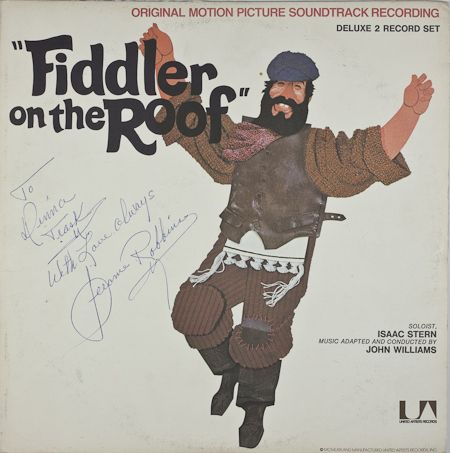 (1918-1998) Prolific Broadway producer whose hits include The King and I and Fiddler on the Roof. An LP of music from the motion picture version of Fiddler on the Roof, signed on the cover: "To Donna Trask with love always Jerome Robbins". Record not played, cover condition is very good. Along with LIBERACE, a signed oversize commemorative volume celebrating The Liberace Show, fine condition. Two pieces.