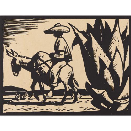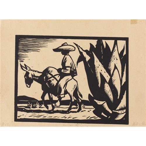 <B>JERRY BYWATERS (1906-1989)</B></I><BR>Untitled, late 1920s to early 1930s<BR>Block print<BR>6in. x 8in.<BR>Signed lower right in block<BR>Signed verso<BR><BR>This print may have been done in Mexico while Bywaters studied under Diego Rivera.<BR><BR>Provenance:<BR>Collection of the Heard Museum, McKinney, Texas<BR><BR> <B>Condition Report:</B> Excellent condition with 1/4 inch tear at bottom edge outside of image area. Unframed.<BR><BR><b>Shipping:</b> Requires 3rd Party Shipping (<a target="_blank" href="http://www.heritageauctions.com/common/shipping.php">view shipping information</a>)