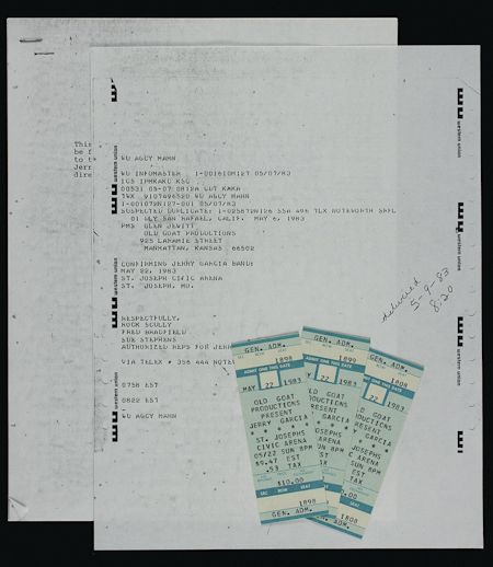 Accompanying the copy of a 12-page concert contract rider are three unused tickets for an appearance at the Civic Arena in St. Joseph, MO. on May 22, 1983. Also included is a copy of a telegram confirming the St. Joseph date. MT.