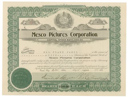 JESSE JAMES, JR. (1875-1951) "Tim", the only son of noted outlaw Jesse James born in Nashville during the height of his father's career as an outlaw. His mother was Zerelda, Jesse James' wife and his first cousin. James, Jr. later moved to Los Angeles and became an attorney. Interesting archive concerning the younger James and his very brief career as a film star portraying his father, includes two stock certificates in MESCO PICTURES, each for five shares, issued to Mrs. Frank James and signed by the film company's vice president, T. T. Crittenden, a D.S., 1p. legal folio, Aug. 21, 1920 witnessed by James, Jr., a receipt for $100.00 paid by Mrs. Frank James for five shares in Mesco., numerous newspaper clippings including an obituary for the younger James, an interesting article citing his trial for train robbery years earlier (an apparent set-up), and optimistic articles concerning Mesco and Kansas City becoming the new hub of the growing film industry, Mesco would make but two films, both in 1921, both concerning Jesse James, and both starring the younger James portraying his father. The films showed the outlaw in a favorable light - more romantic dramas than realistic documentaries. Interesting reading.
