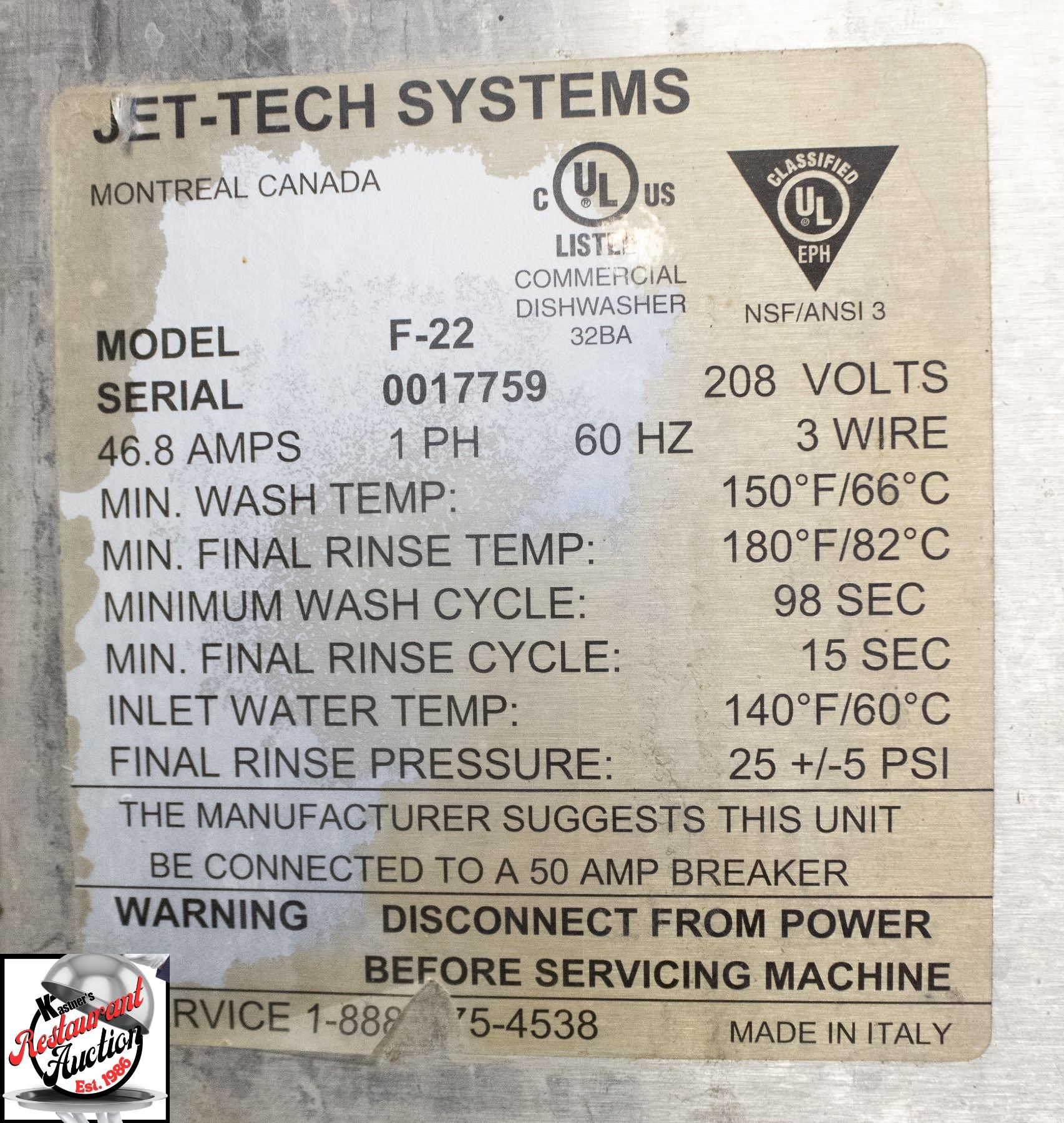 JET-TECH F22 PASS THROUGH DISH WASHER