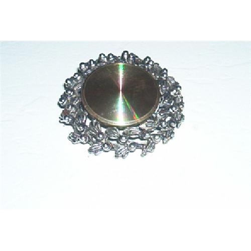 This is a very unique brooch. Vintage Jewelaram Iridescent center. "Refraction Brooch. The outside frame is made of pot metal. The center Iridescent really sparkels with every color that you put it on. Signed on the back: Jewelaram. Measures: 2 inches in diameter. Excellent Condition.