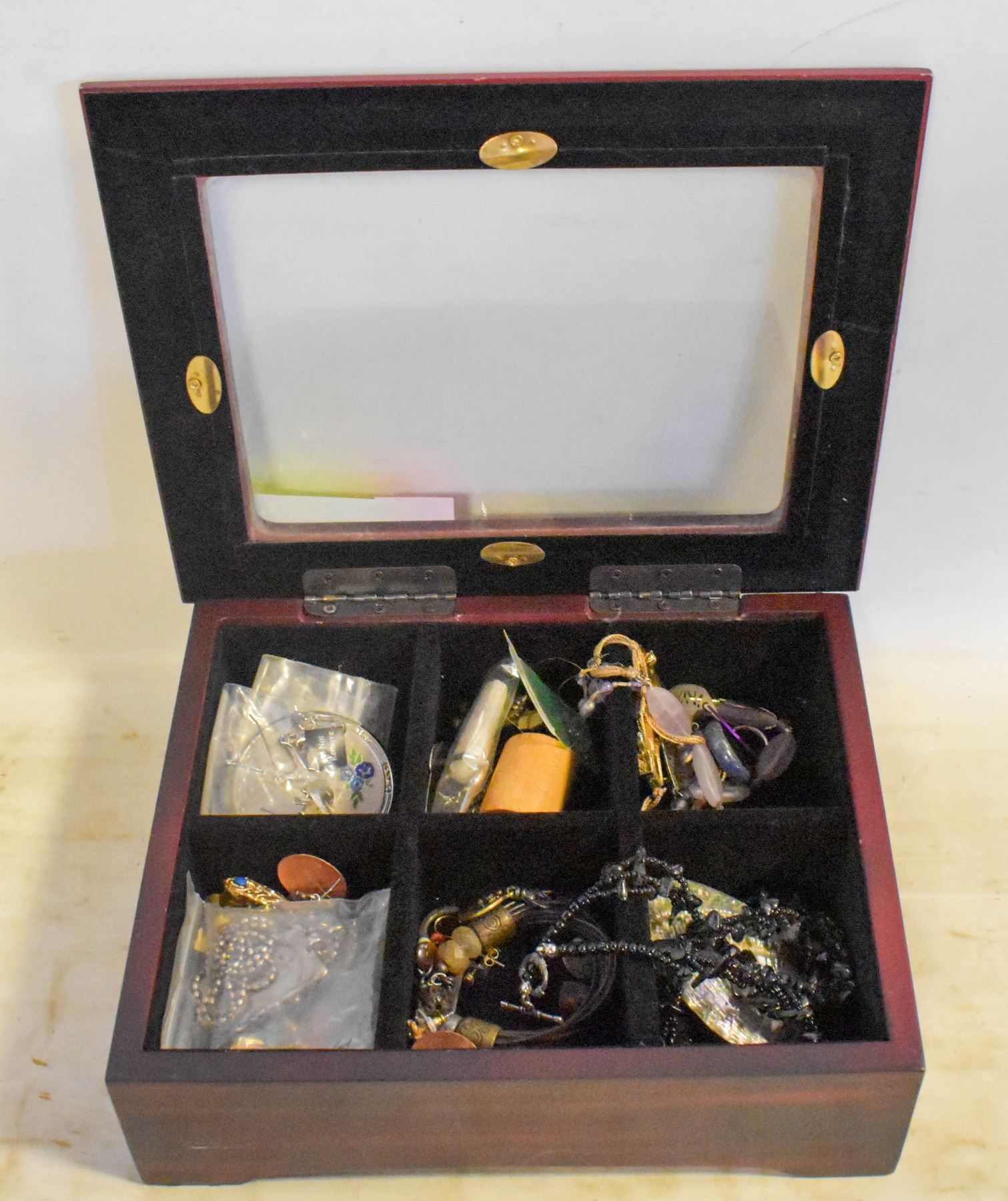 JEWELERY BOX WITH MISC COSTUME JEWLERY+BROOCHES