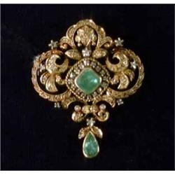 BROSCH/HÄNGE, GULD MED 2 FASETTSLIPADE SMARAGDER CA. 2 CT SAMT EN MÄNGD FASETTSLIPADE DIAMANTER CA 0,75 CT SAMT ORIENTALISKA PÄRLOR, ITALIEN TIDIGT 1900-TAL, H4,8, B4
