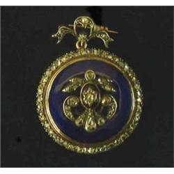 HÄNGE, GULD/SILVER, EMALJ, CABUCHONSLIPAD GRANAT SAMT EN MÄNGD FASETTSLIPADE DIAMANTER, BAKSIDAN MED MEDALJONG S.K "HÅRGÖMMA" TROLIGEN ENGLAND 1800-TALETS ANDRA HÄLFT