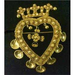 BROSCH, FÖRGYLLT SILVER, HJÄRTA MED KRÖNANDE KRONA, KLÄPPAR, NORGE, 1800-TALETS SENARE DEL, H11, B8