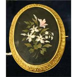 BROSCH, GULD, RIK ORNAMENTIK, INFATTAD PIETRA DURA, ITALIEN C. 1900