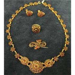 SMYCKEGARNITYR, FÖRGYLLD METALL, FASETTSLIPADE GRANATER, HALSCOLLIER, BROSCH, RING SAMT I PAR ÖRHÄNGEN (5)