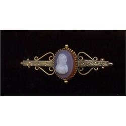 JEWELLERY AND WATCHES - A 9ct gold stone cameo bar brooch, the decorative bar of scroll and foli...
