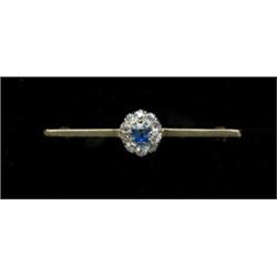 A sapphire and diamond bar brooch, c.1930, the central sapphire within a border of ten old cut slightly ovoid diamonds