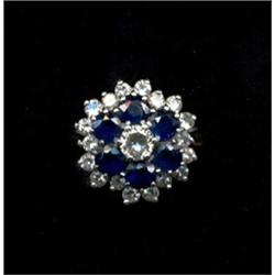 A sapphire and diamond cluster ring, c.1970, the larger central brilliant cut diamond within a surround of six circular cut sapphire within a way border of smaller brilliant cut diamonds