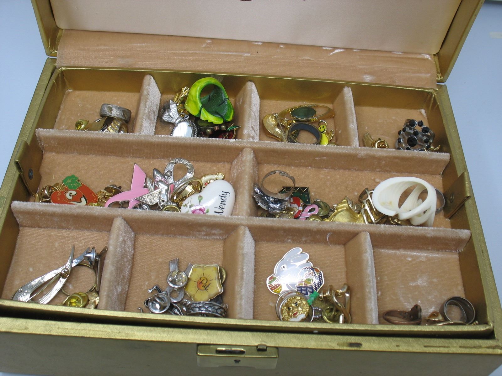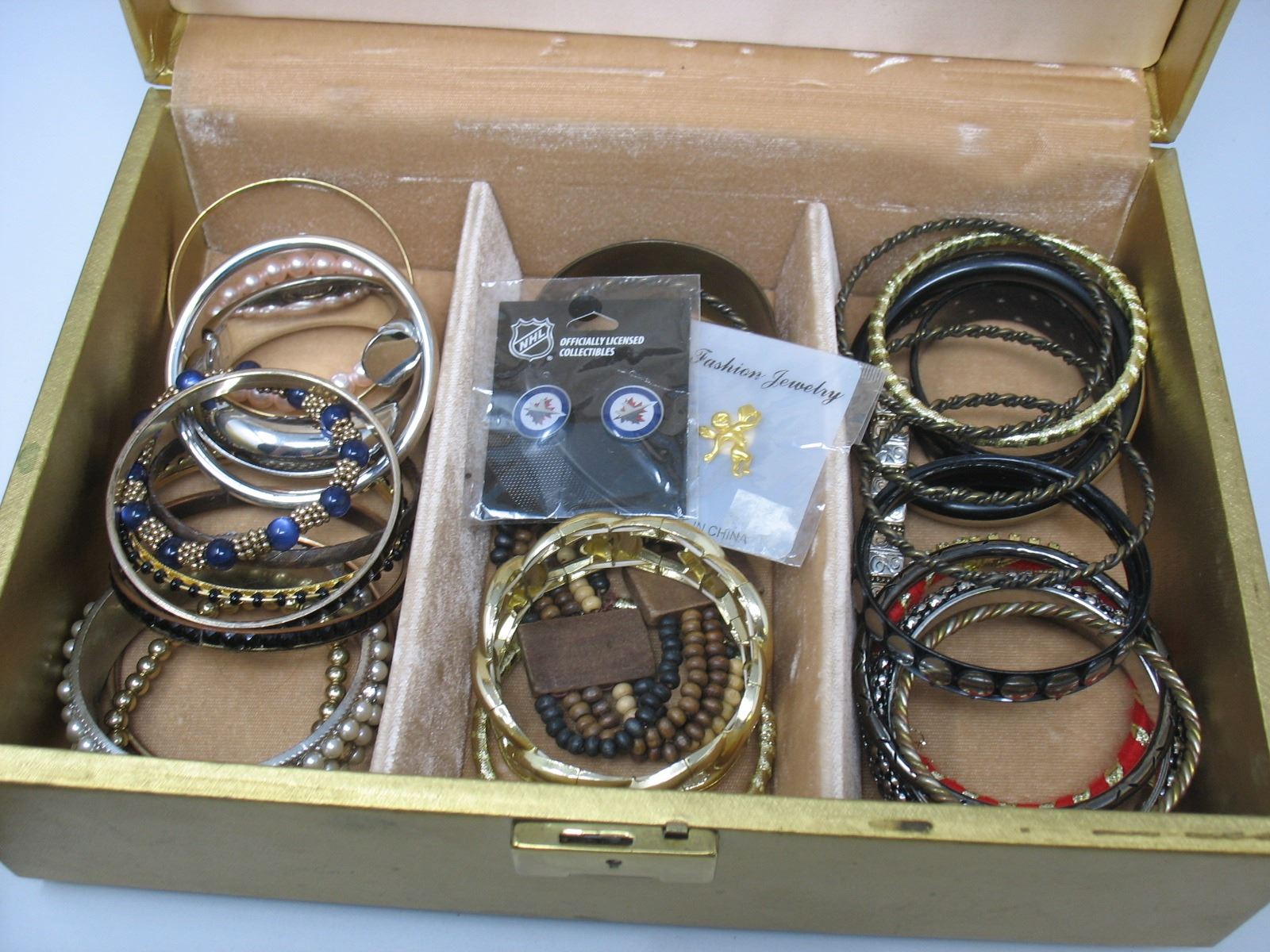 JEWELLERY BOX - LARGE LOT OF BRACELETS - PINS - RINGS and MISC.